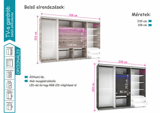 BOND TV-s magasfényű gardrób+2fózolt t.ajtó (318cm)