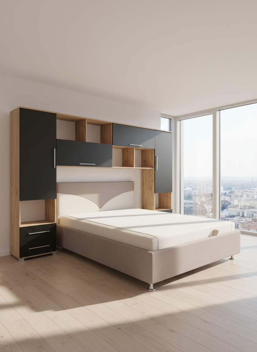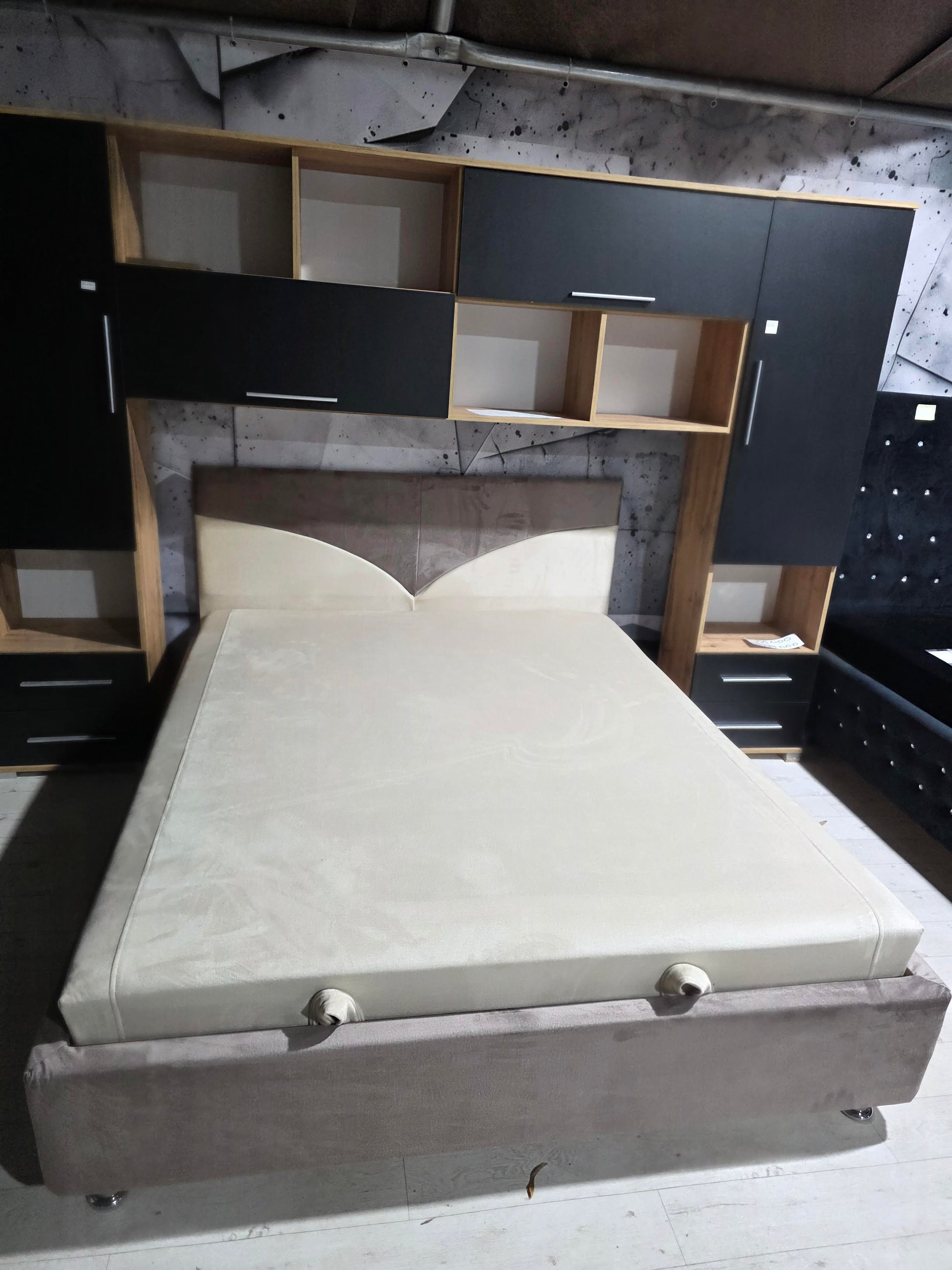 Extra rugós, szövetes franciaágy, ágyneműtartóval.