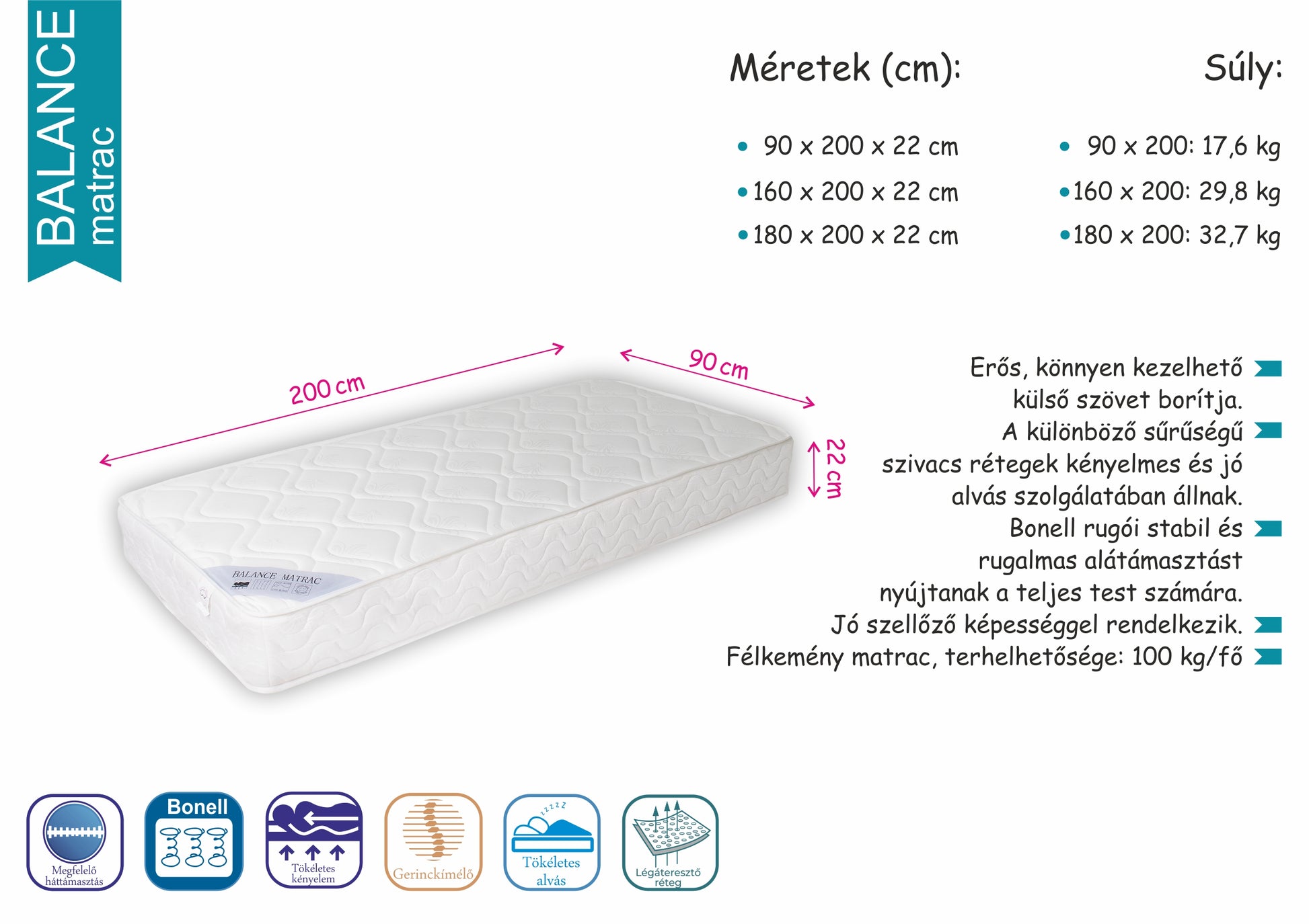 Erős, könnyen kezelhető külső szövet borítja. A különböző sűrűségű szivacs rétegek kényelmes és jó alvás szolgálatában állnak. Bonell rugói stabil és rugalmas alátámasztást nyújtanak a teljes test számára. Jó szellőző képességgel rendelkezik.