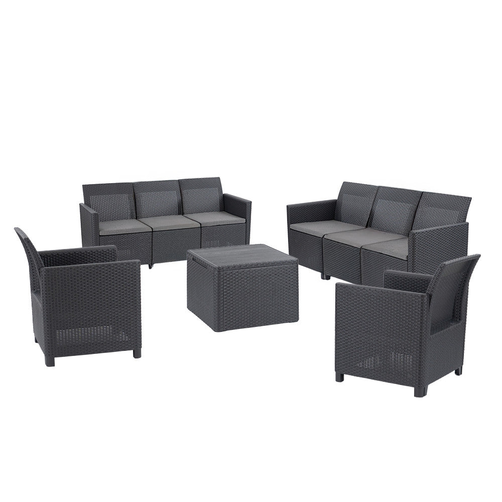 Ez egy rattan stílusra emlékeztető elegáns bútor szett két fotellel, két három személyes kanapéval és egy párnatartós asztallal. Ez a bútor szett kellemessé teszi a kertben vagy a teraszon töltött nyári napokat. A könnyű és egyúttal stabil szerkezetű bútorok tisztítása nagyon egyszerű. A szett ellenálló a sérülésekkel és az időjárás hosszan tartó viszontagságaival, illetve az UV sugárzással szemben is.