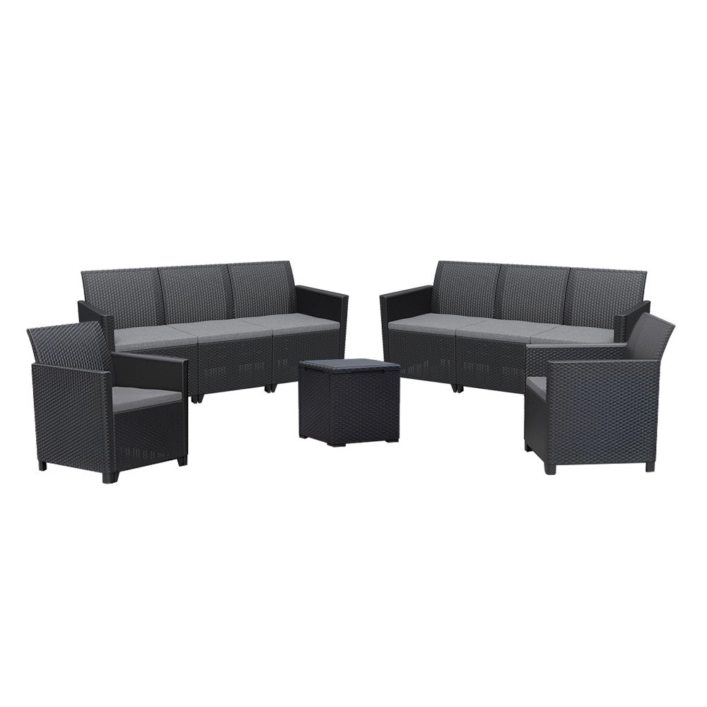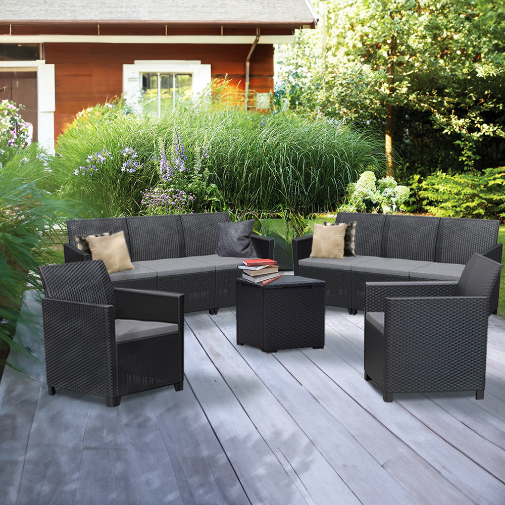 Ez a Grafit színű rattan hatású kerti bútor szett két fotellel, két 3 személyes sarokkanapéval és egy tárolós asztallal rendelkezik, amelyeket időjárásálló műanyagból készítettek, így nem kell aggódnod a UV sugárzás hatásaitól sem. A fotel magassága: 74 cm, szélessége: 63 cm, hossza: 65 cm. A fotel és a kanapé párnával rendelkezik, mely kényelmessé teszi és színben passzol a bútorhoz. Az asztal magassága: 37 cm, szélessége: 37 cm, hossza: 37. Az asztal több funkciós, így a tároló részében elrejtheted a kerti eszközöket.