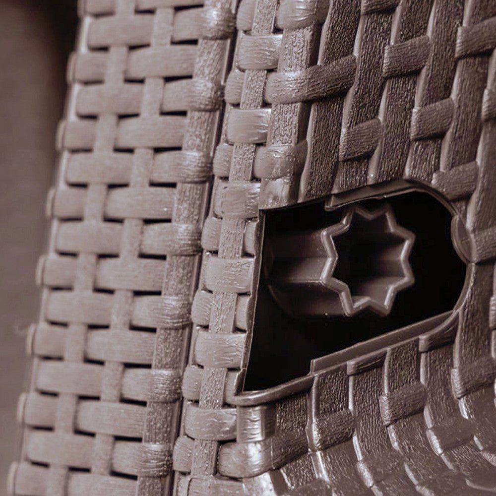 A bemutatott készlet megvalósítása - polyrattan utánzása. A bútorok anyaga tökéletesen utánozza a polirattant - valójában nehéz megkülönböztetni a valódi fonattól. A polipropilén mellett a gyárilag préselt polipropilén időjárásálló. Az erős napsütésben is védett a fakulás ellen, köszönhetően annak, hogy a polipropilén ellenáll az UV sugárzásnak . Ebből az anyagból készült bútorokat szintén nagyon könnyű tisztán tartani. Kis mennyiségű mosószer vagy akár nedves ruha is elegendő a makacs foltok megszabadításához.