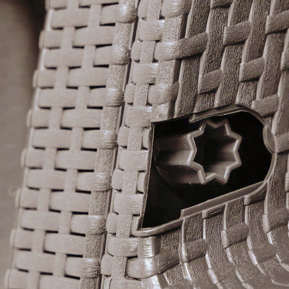 A praktikus műanyag kerti bútorszett több bútor kombinációja. Egy tágas sarokülő szépen körvonalazott háttámlákkal és kényelmes karfákkal rendelkezik. A szett tartalmaz egy praktikus dohányzóasztalt ahol a szabadban vacsorázhat a családjával. A sarokülő kényelmes párnákkal van ellátva, párnahuzatokkal, amelyek cipzárral rendelkeznek, így a párnahuzatok könnyen moshatók. Ezenkívül az asztallal ellátott kerti szett gyakorlati jellemzője, hogy a kartámaszok olyan magasságban vannak, hogy lehetővé teszik a fotelek behelyezését az asztal alá, ennek köszönhetően helyet takaríthatunk meg.