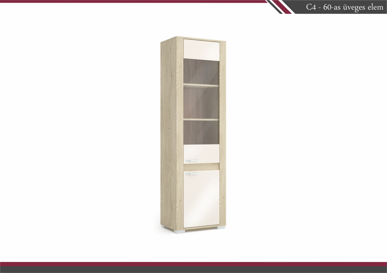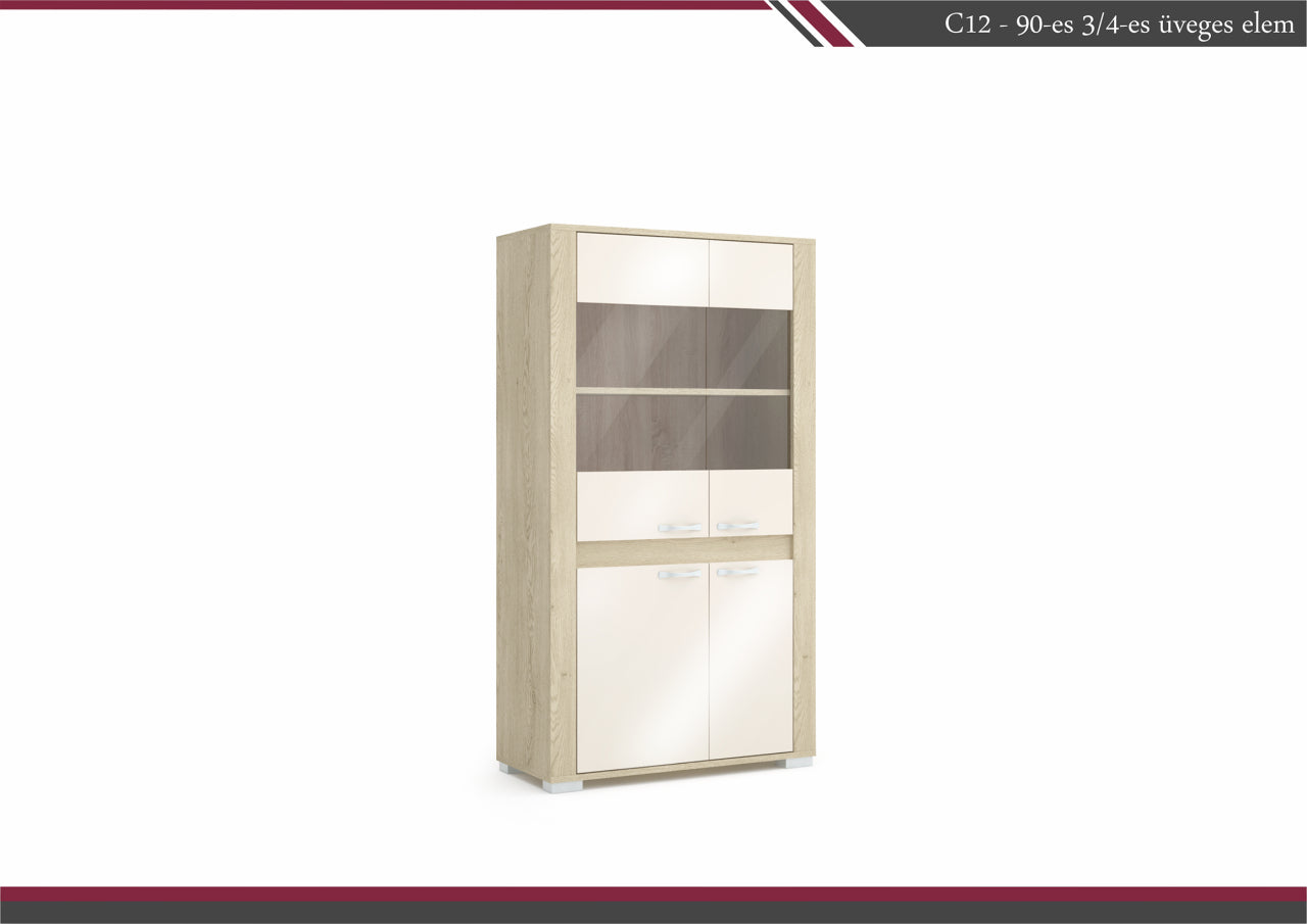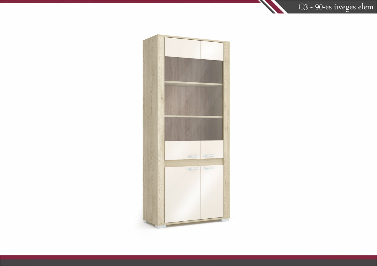 A 18 elemből álló Cortina elemes bútorcsalád cotta cremona színű korpuszához magasfényű beige front társul, így elegáns, letisztult elemekből álló összeállítás készíthető. A ruhás, polcos és komód elemekből található teleajtós és üveges kialakítású is, így teljesen a saját igényünkre szabhatjuk nappalink vagy akár hálónk berendezését. Az üveges elemekbe opcionálisan LED világítás is kérhető.