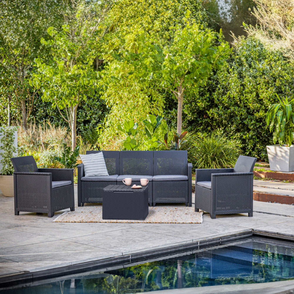 Ez a grafit színű rattan hatású kerti bútor szett két fotellel, egy kanapéval és egy több funkciós asztallal rendelkezik, amelyeket időjárásálló műanyagból készítettek, így nem kell aggódnod a UV sugárzás hatásaitól sem.