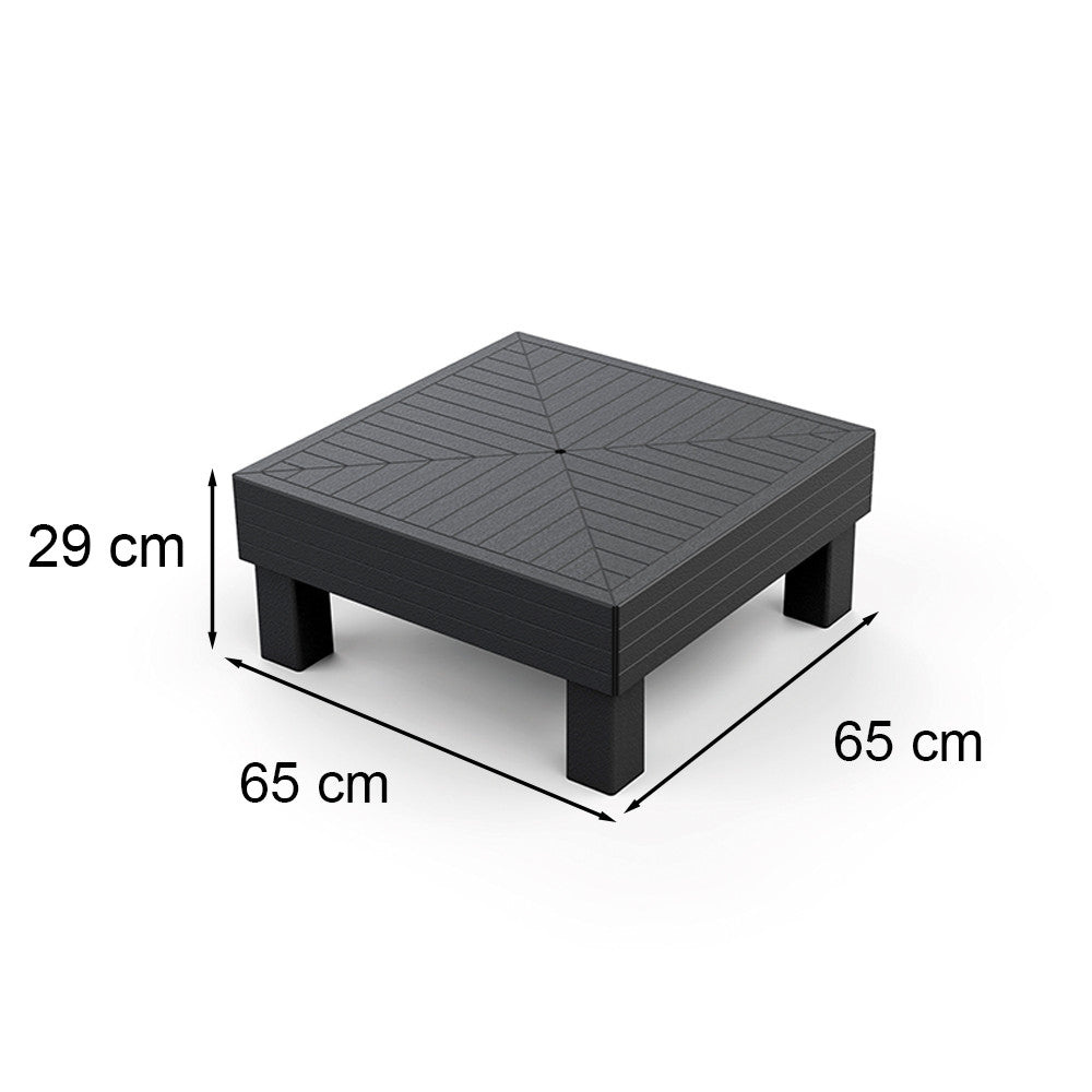 A 65 cm x 65 cm méretű és 29 cm asztal magas minőségű, időjárásálló anyagokból készült, amelyek garantálják a hosszú élettartamot és az egyszerű karbantartást. Az UV-sugárzással szembeni ellenálló képessége révén az asztal színe nem fakul, és a kültéri használat során is megőrzi minőségét.