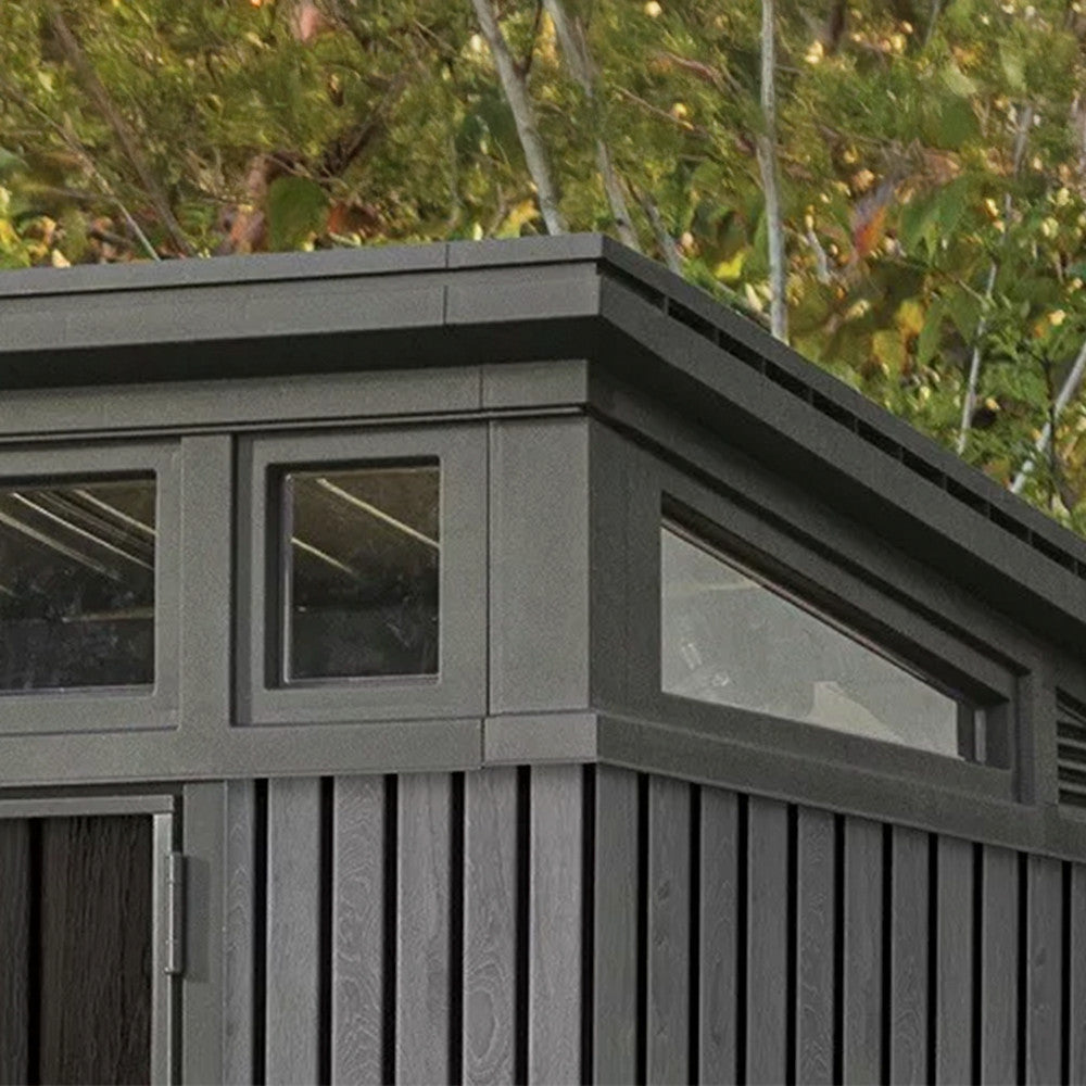 A Decocoat technológiával készült műanyag panelek természetes fa hatást keltenek, miközben teljesen gondozásmentesek. A megerősített acélszerkezet stabilitást biztosít, a lakattal zárható ajtó pedig extra védelmet nyújt. Méretei 216x218x226 cm.