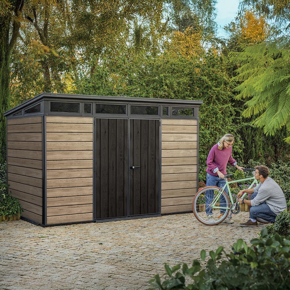 A Signature PENT 11x7 kerti ház ötvözi az esztétikát és a funkcionalitást. A ferde tető és letisztult vonalvezetés tökéletesen illeszkedik a modern kertépítési trendekhez, míg a kőrisfa színű DECOCOAT technológia időjárásálló felületet biztosít.