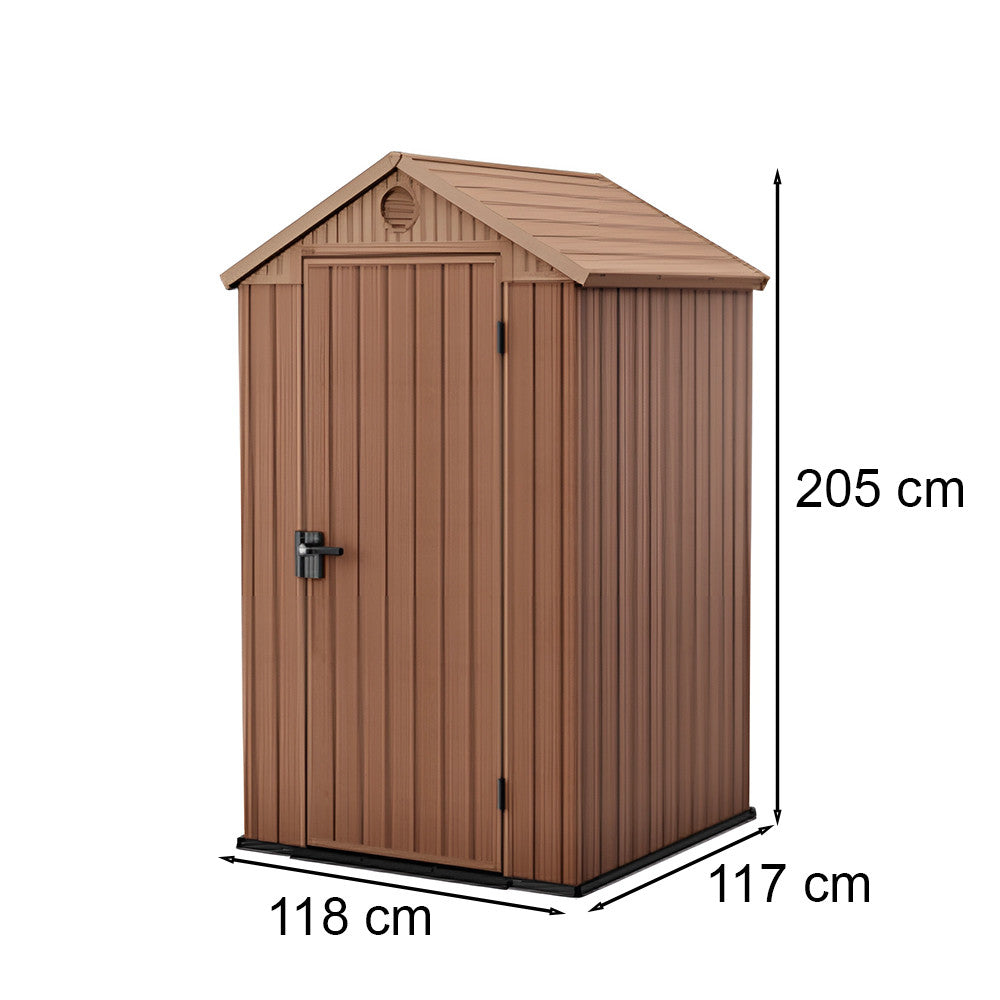 Méretei: 118 x 117 x 205 cm, ami ideális teret biztosít a kerti szerszámok, kerti bútorok, vagy akár a kerékpárok tárolására. Ezek a méretek tökéletesen illeszkednek a legtöbb kertbe, anélkül, hogy túl nagy helyet foglalnának.