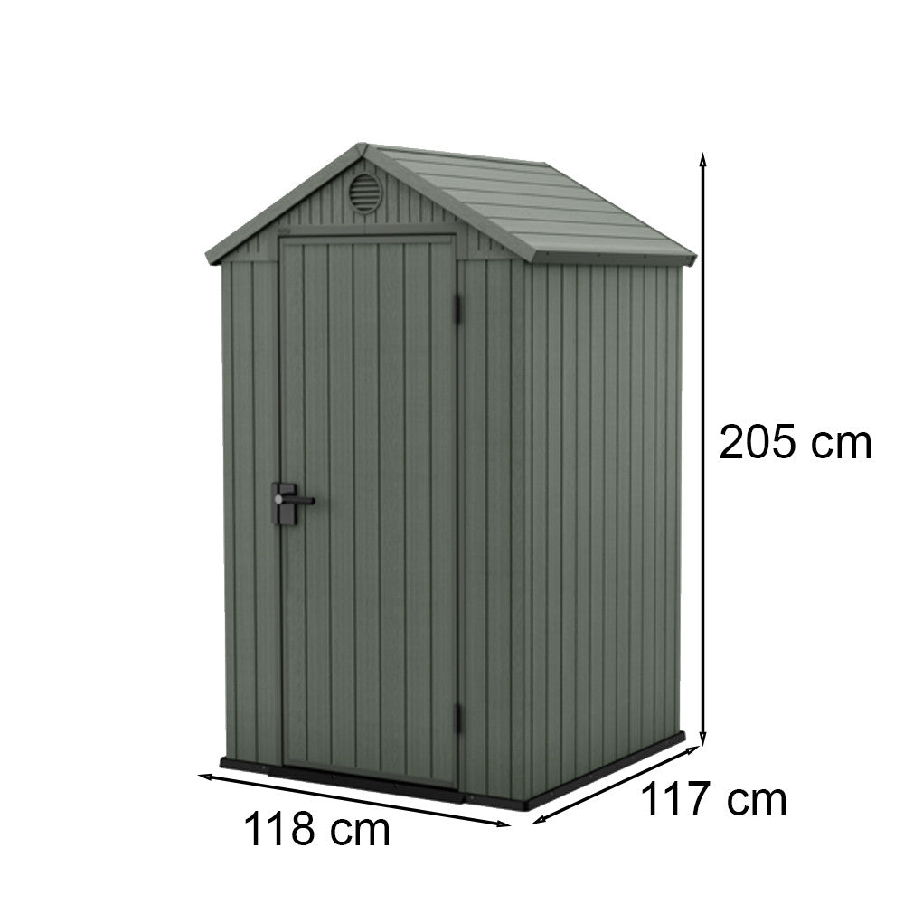 Méretei: 118 cm x 117 cm x 205 cm, ami ideális teret biztosít a kerti szerszámok, kerti bútorok, vagy akár a kerékpárok tárolására. Ezek a méretek tökéletesen illeszkednek a legtöbb kertbe, anélkül, hogy túl nagy helyet foglalnának.