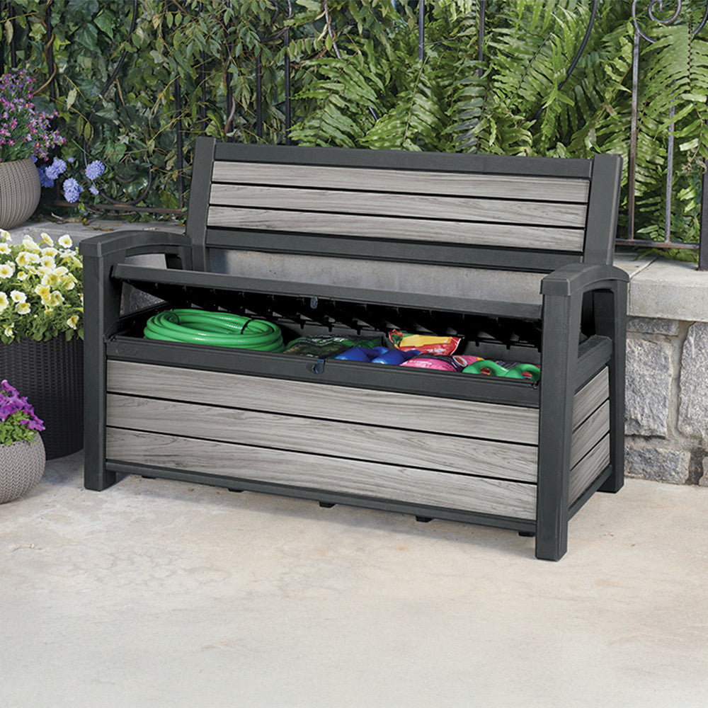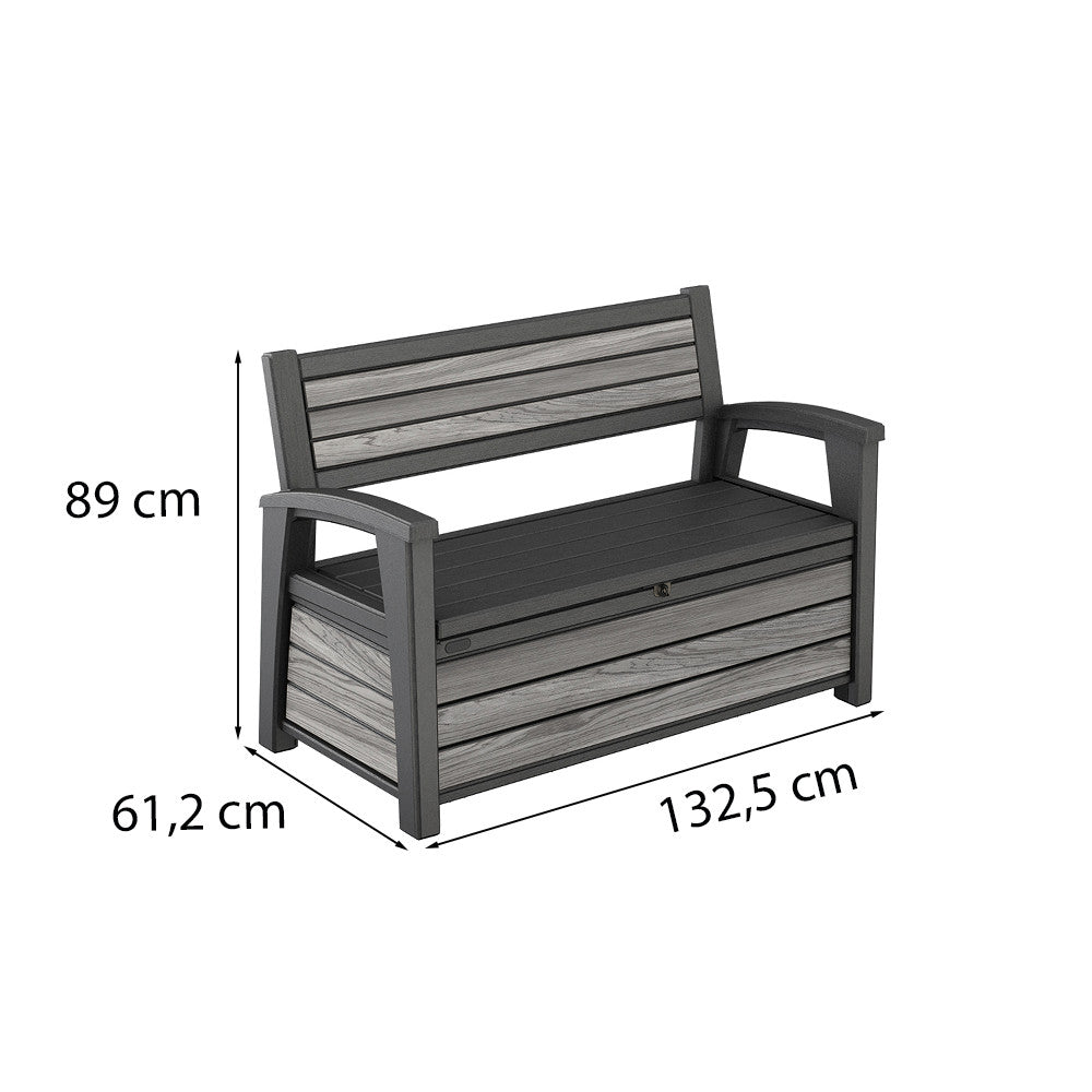 A Keter Decocoat műanyag kerti pad/tároló 227 L viharszürke színben tökéletesen ötvözi az esztétikus megjelenést és a praktikus tárolást. 132,5 cm széles, 89 cm magas és 61,2 cm mély, így elegendő helyet biztosít a legkülönfélébb holmiknak — a locsolótömlőtől a kerti párnákig. Erős, időjárásálló műanyagból készült, fa hatású felülettel, amely elegánsan illeszkedik bármilyen kertbe vagy teraszra. Gázteleszkópos fedele könnyed nyitást biztosít, és lakattal is zárható (lakat nem tartozék).