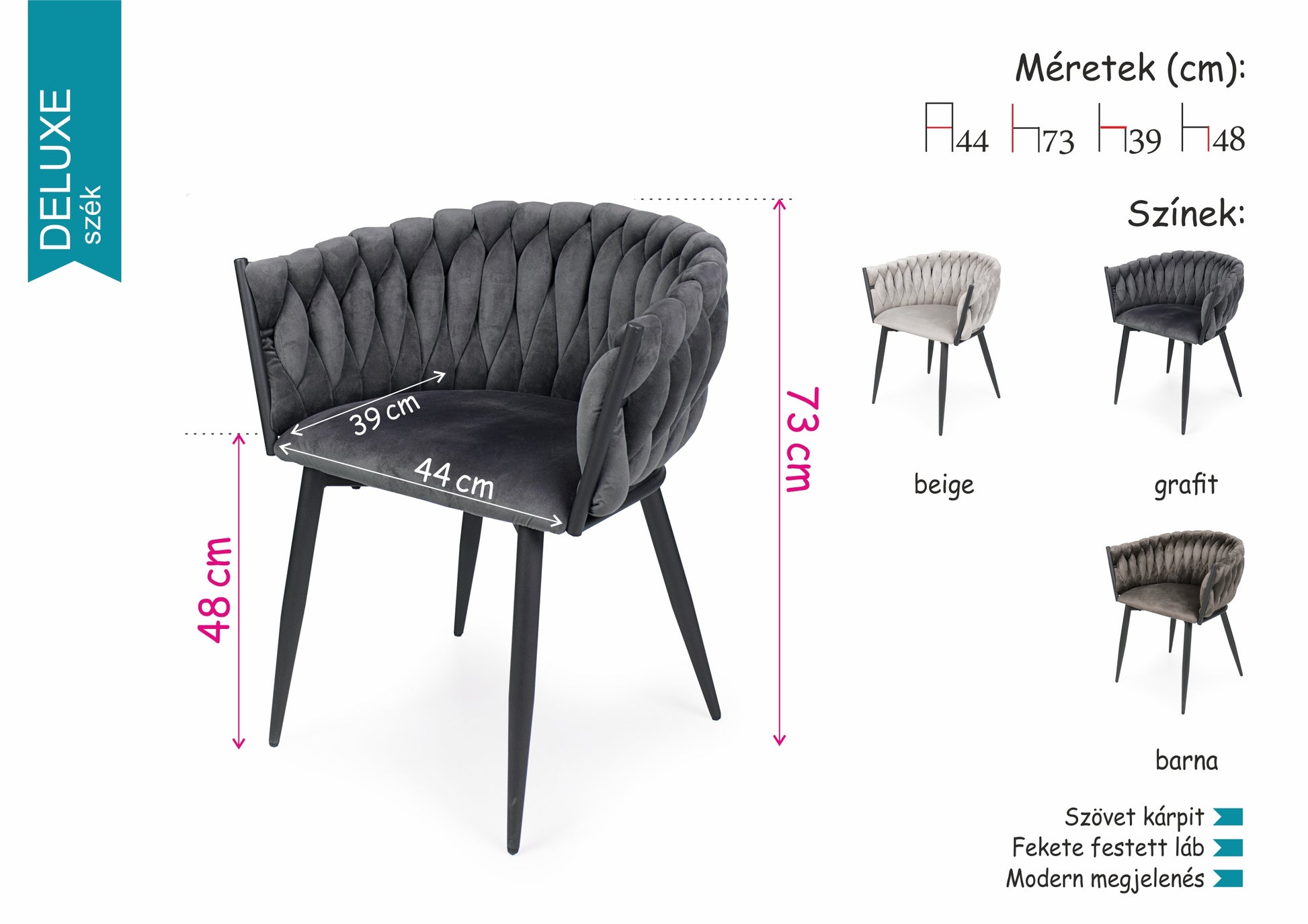 A krómozott fém lábaknak köszönhetően tökéletesen stabil ülőalkalmatosság. Három színben kapható: világosszürke, sötétszürke, barna.