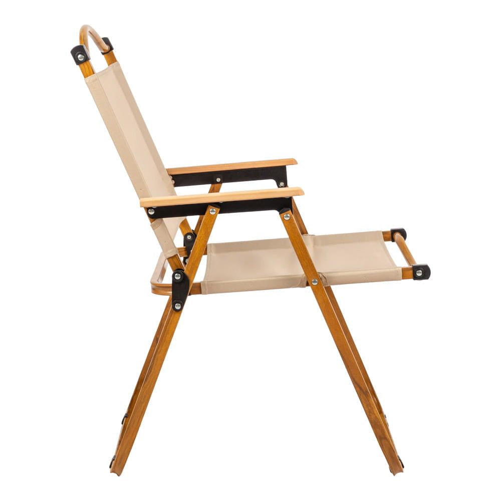 A kényelmes kempingszék a funkcionalitást és az eleganciát ötvözi. A magasabb háttámlával ellátott szék a szabadban való pihenés kényelmét szolgálja. A váz acélból készült fahatású festéssel, amely garantálja a szerkezet megbízhatóságát és szilárdságát. A fa karfák további varázst adnak, miközben hangsúlyozzák a tartósságot.
