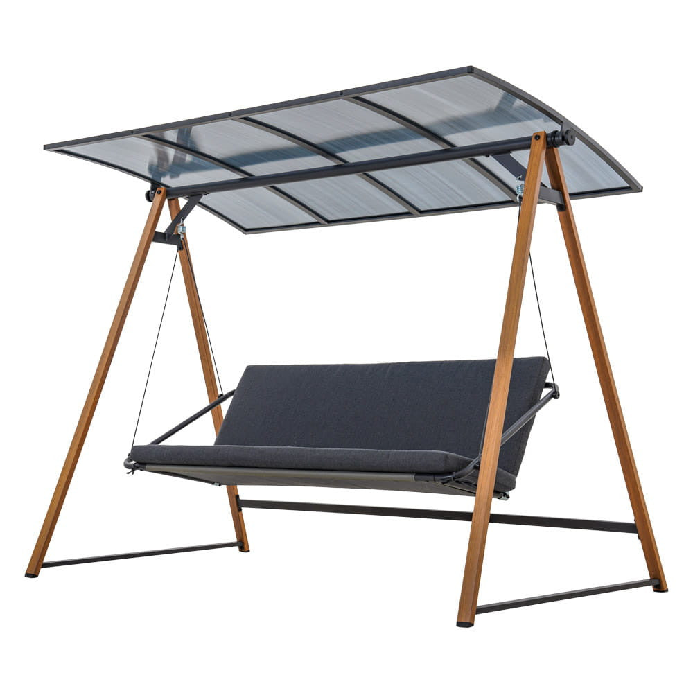 A porszórt acélból készült kerti hinta a tartósságával tűnik ki – anyaga ellenáll a korróziónak és a változó időjárási viszonyoknak, így a bútor hosszabb ideig használható. Az ülőpárna poliészterből készült, melynek alacsony a vízfelvétele és könnyen ápolható. A hinta nagy előnye a polikarbonát tető, amely hatékonyan véd a túlzott napsütéstől vagy az enyhe esőtől.