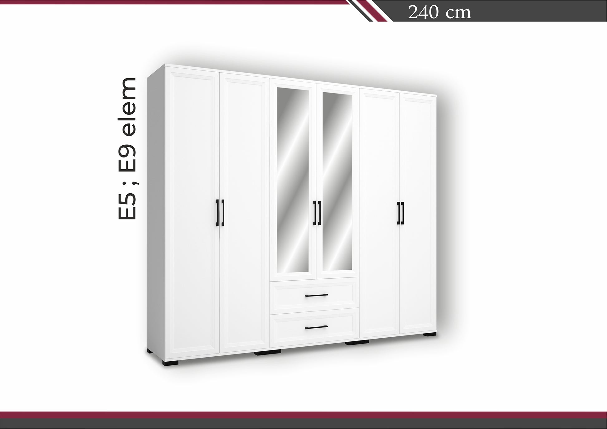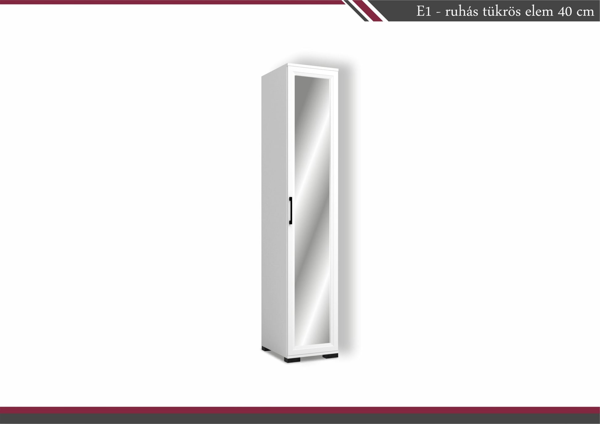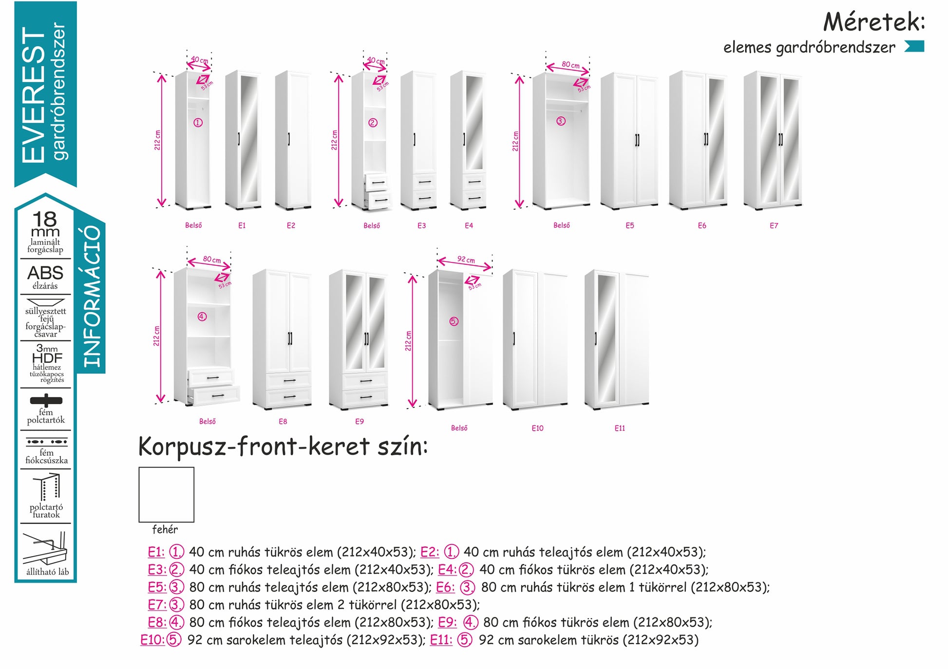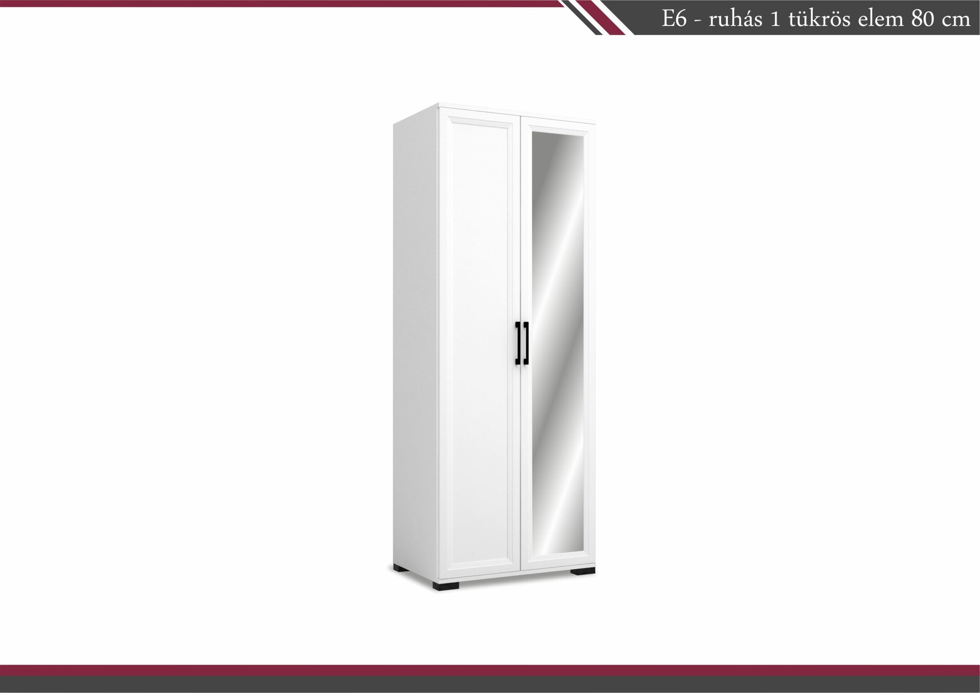 Az Everest elemes gardróbrendszer egy praktikus és rugalmas tárolási megoldás, amely lehetővé teszi a ruhák és más tárgyak rendszerezett elhelyezését. A fehér színű keretes elemeknek elegáns megjelenést ad a fekete fogó és láb. Az elemek rendelhetőek teleajtós vagy tükrös változatban.