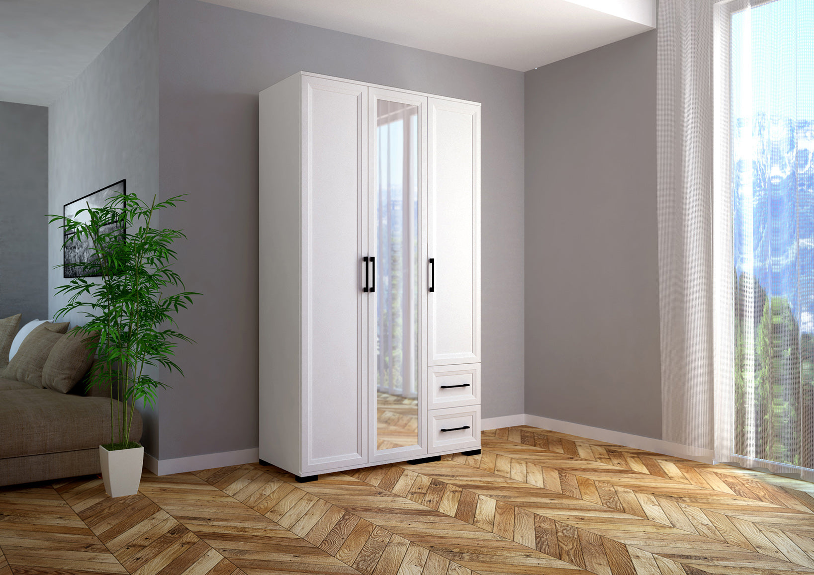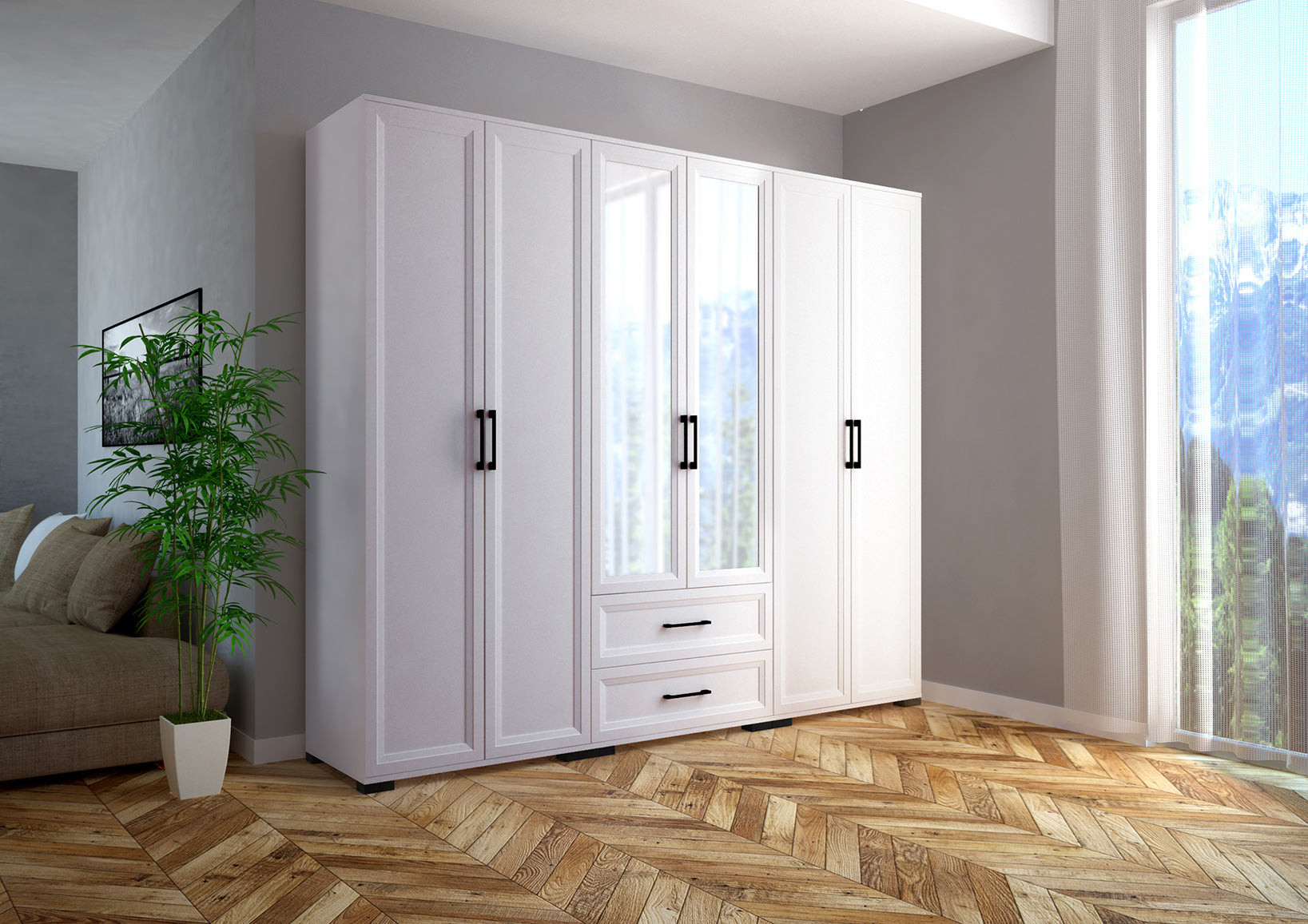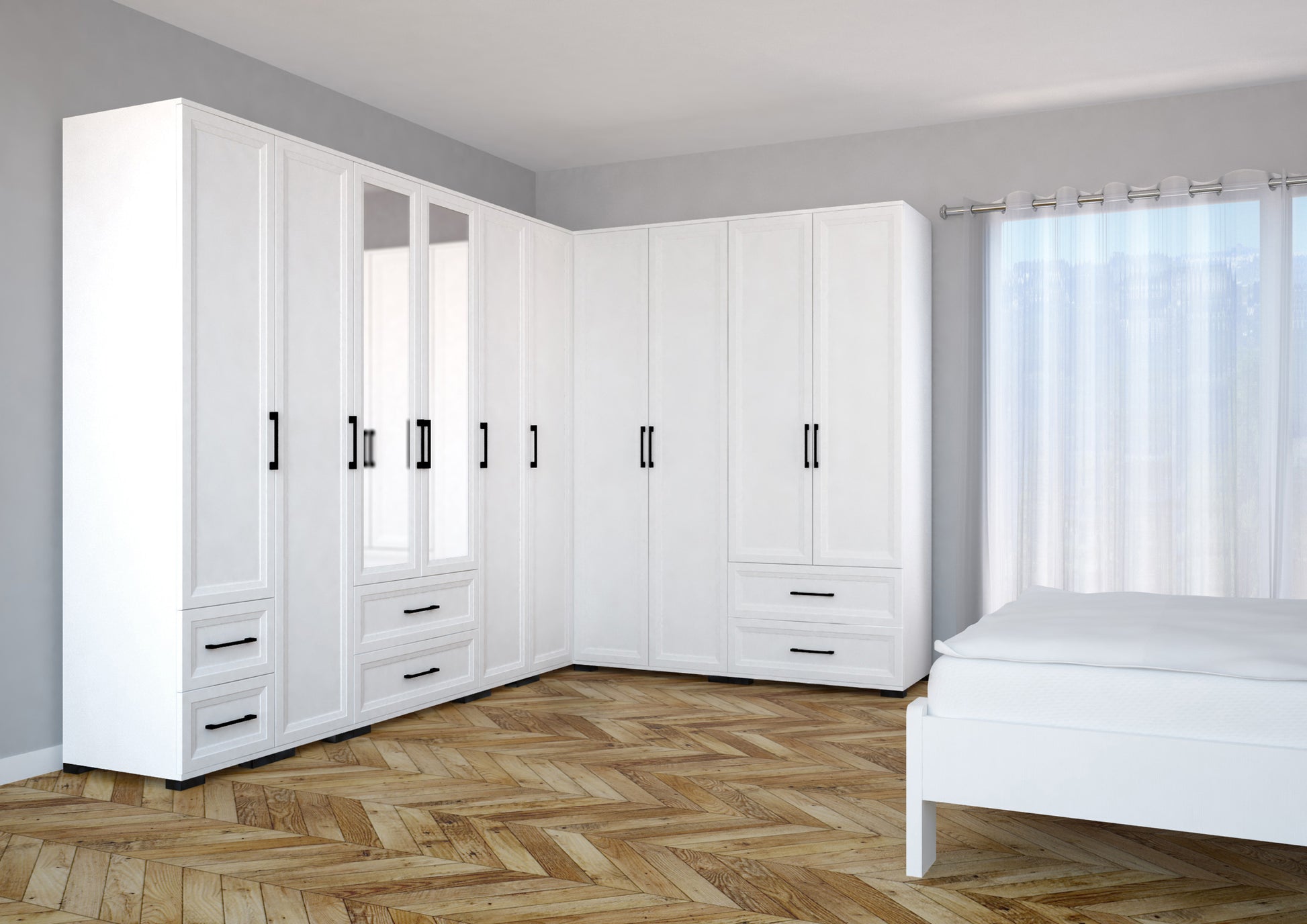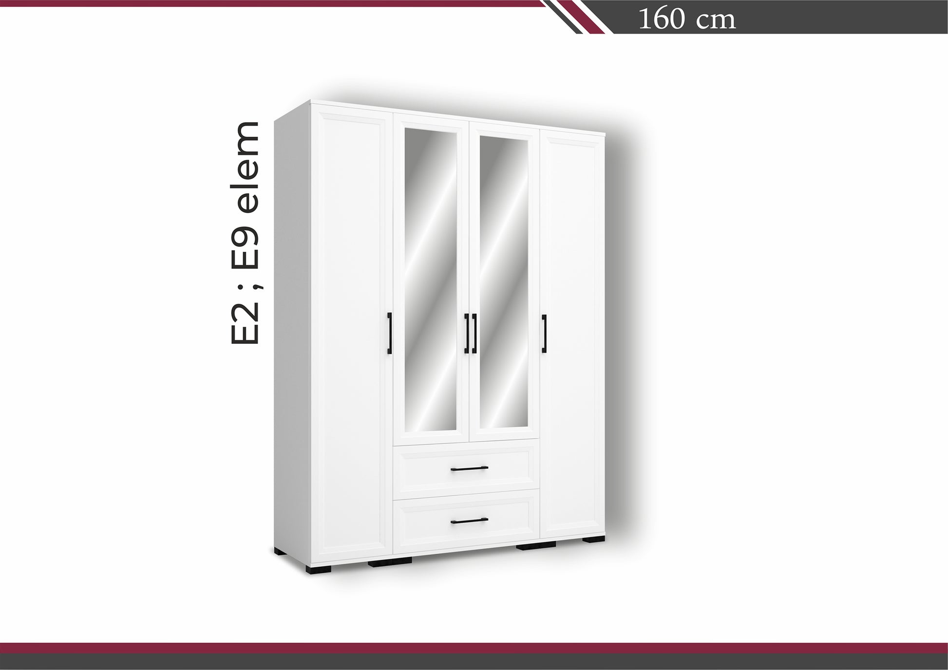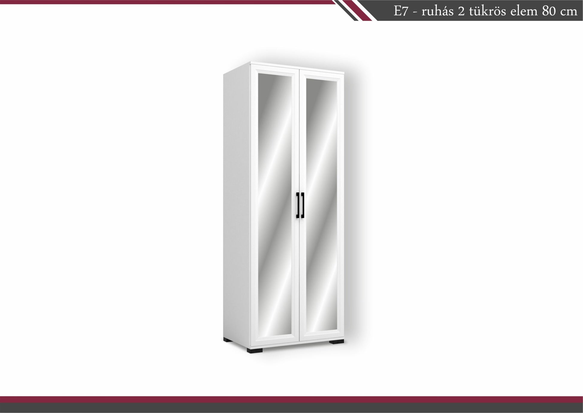 Az Everest elemes gardróbrendszer egy praktikus és rugalmas tárolási megoldás, amely lehetővé teszi a ruhák és más tárgyak rendszerezett elhelyezését. A fehér színű keretes elemeknek elegáns megjelenést ad a fekete fogó és láb. Az elemek rendelhetőek teleajtós vagy tükrös változatban.
