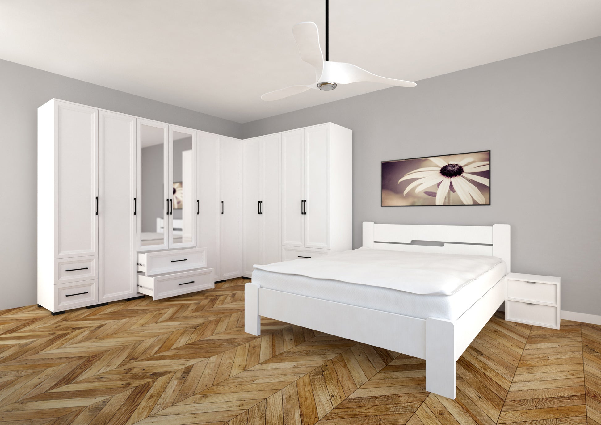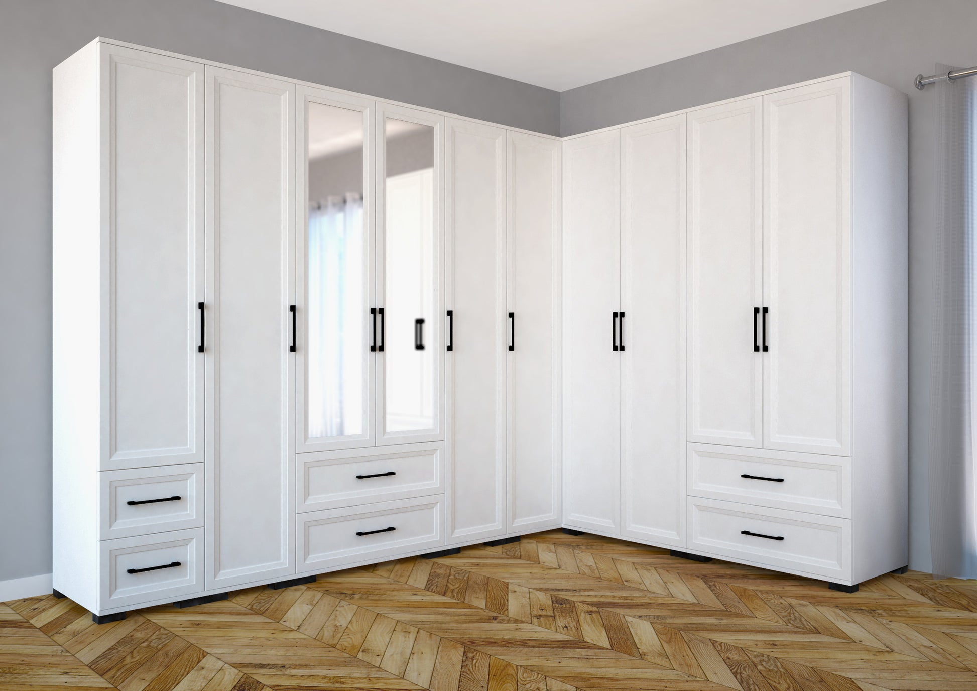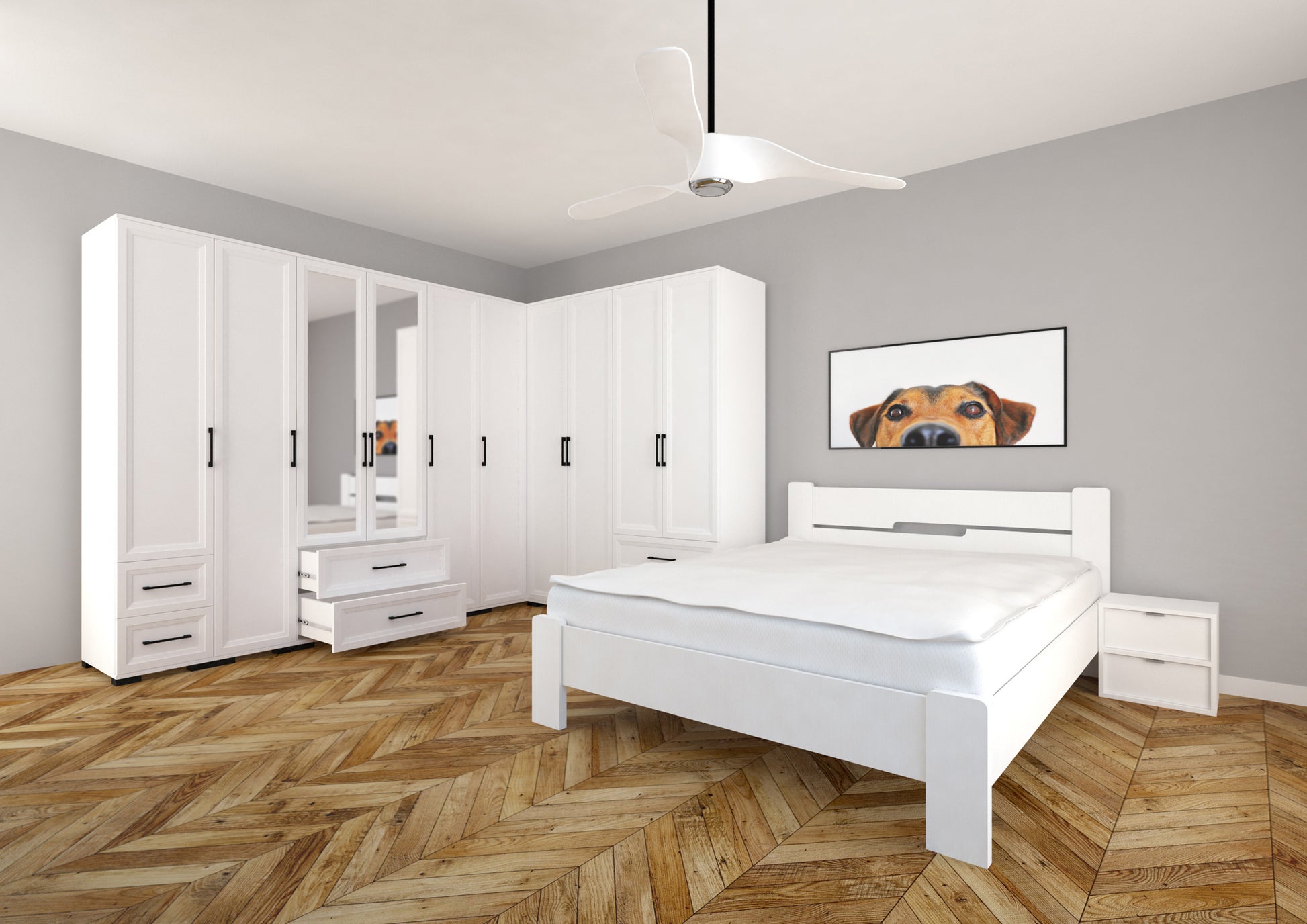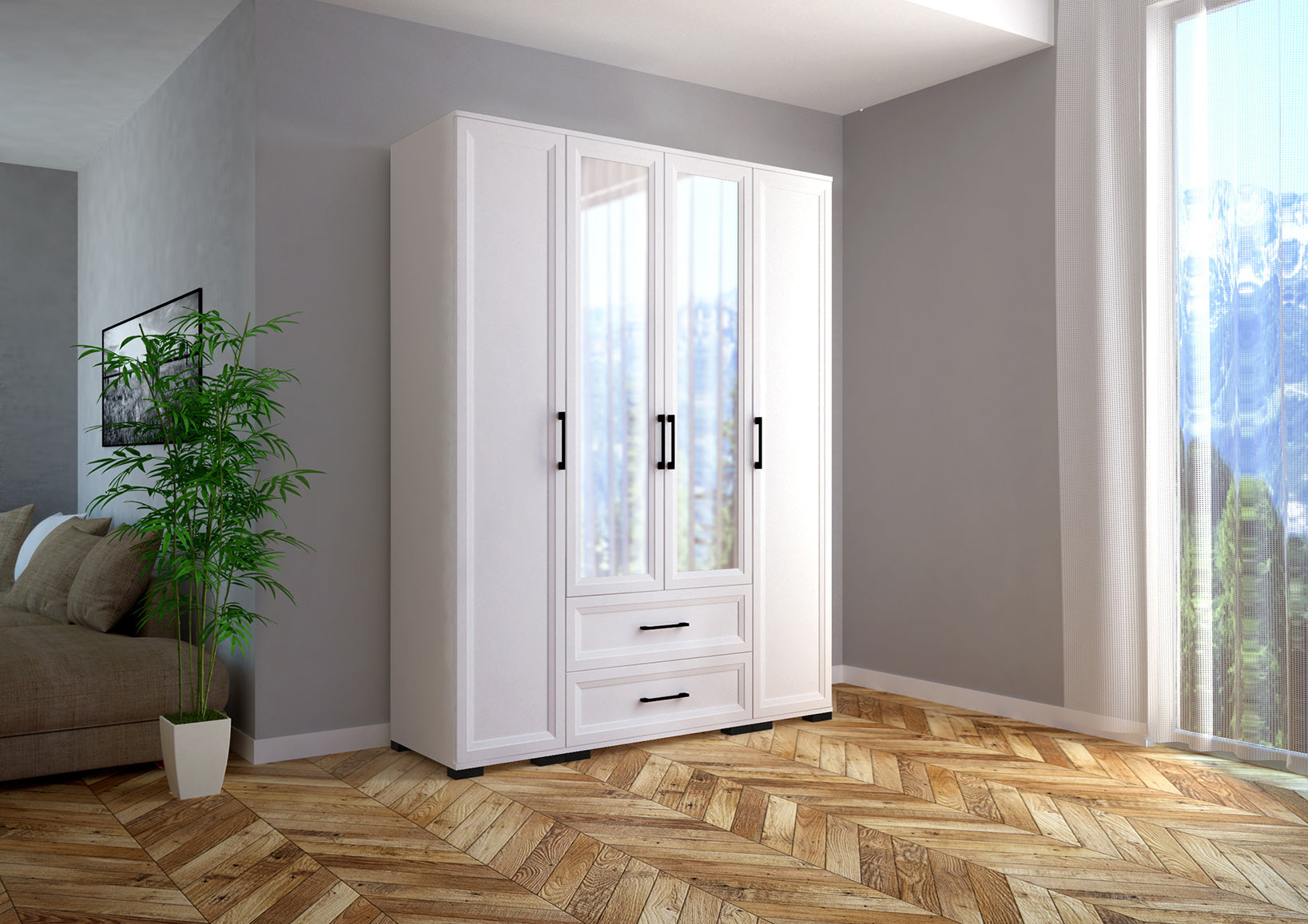 Az Everest elemes gardróbrendszer egy praktikus és rugalmas tárolási megoldás, amely lehetővé teszi a ruhák és más tárgyak rendszerezett elhelyezését. A fehér színű keretes elemeknek elegáns megjelenést ad a fekete fogó és láb. Az elemek rendelhetőek teleajtós vagy tükrös változatban.
