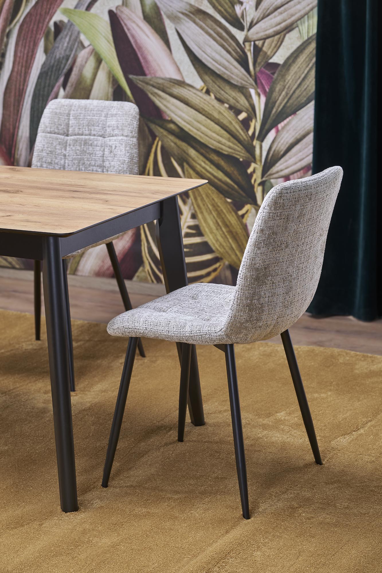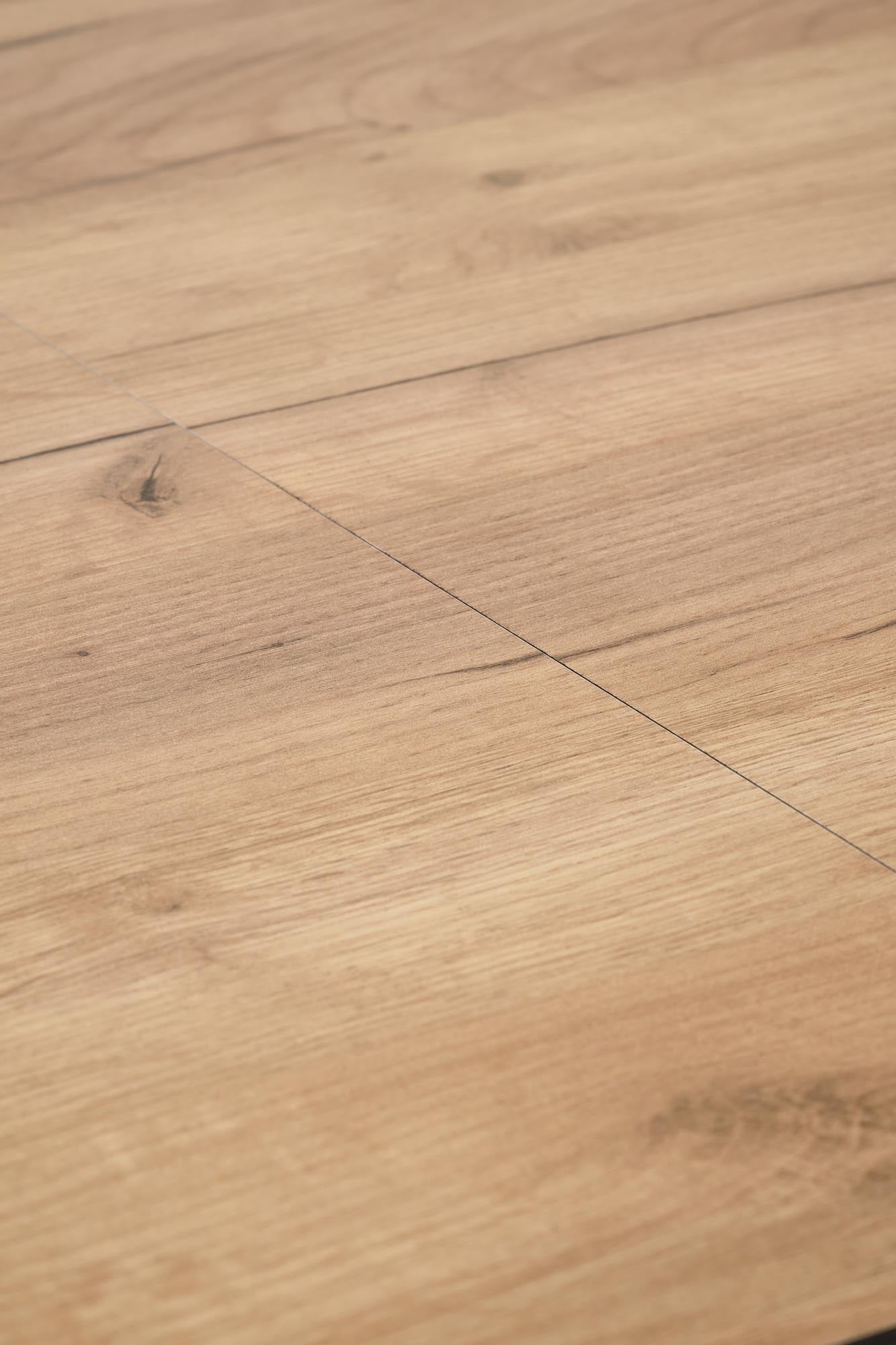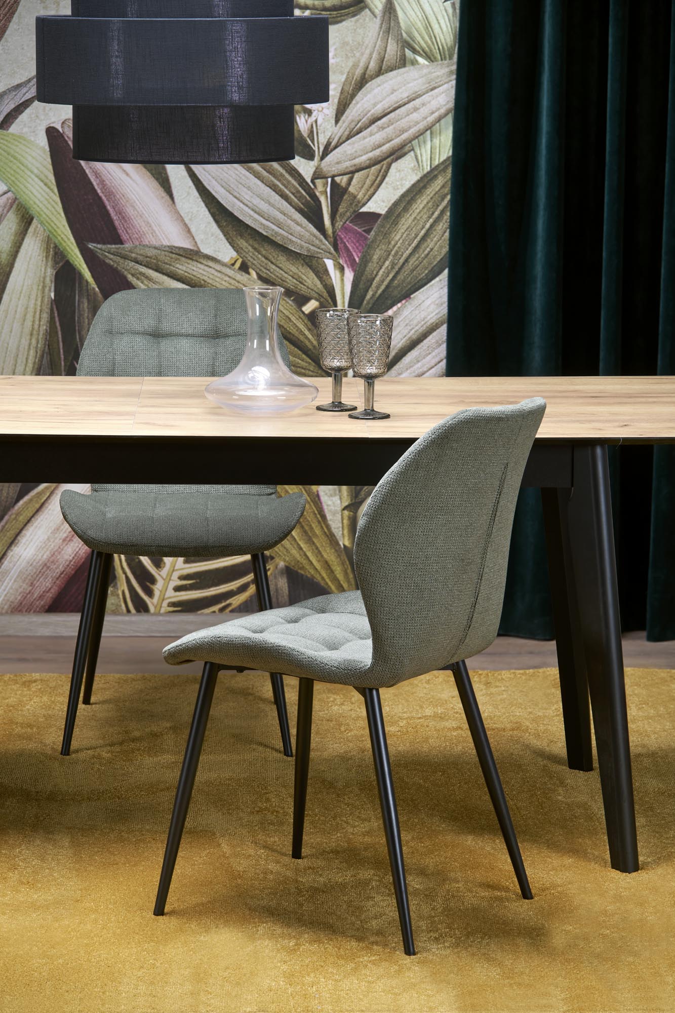 méretek: wymiarry: 140-180/90/76/153 cm; bővítőasztal, anyaga: laminált forgácslap / tömörfa, szín: felső - wotan tölgy, lábak - fekete