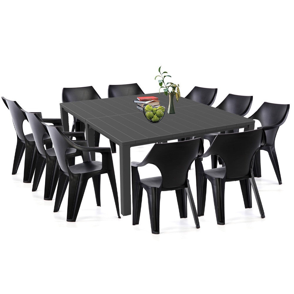A grafit színű műanyag kerti bútor szett tíz darab 57 x 57 x 79 cm-es székből és két 147,5 x 90 x 74,5 cm-es asztalból áll. Ez egy kiváló minőségű termék, amely a legjobb minőségű fröccsöntött műanyagból készült.