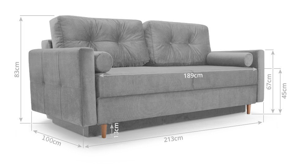külső méret: 213 × 100 cm, fekvőfelület: 153 x 189 cm, ülőmagasság: 45 cm, beülőmélység (párnával): 50 cm, teljes magasság: 83 cm