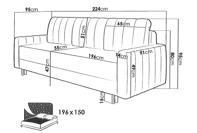 külső méret: 224 × 95 cm, fekvőfelület: 196 x 150 cm, ülőmagasság: 47 cm, beülőmélység (párnával): 55 cm, teljes magasság: 95 cm