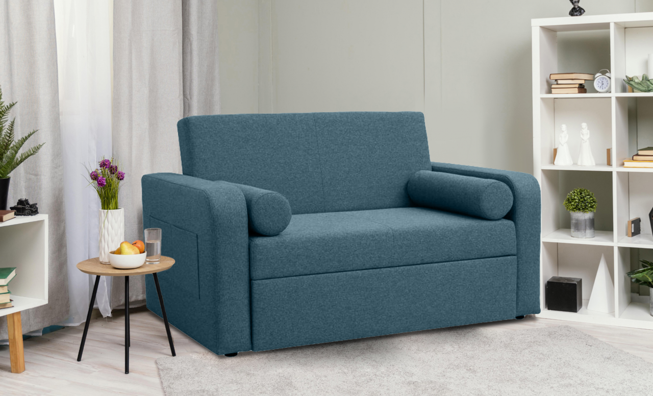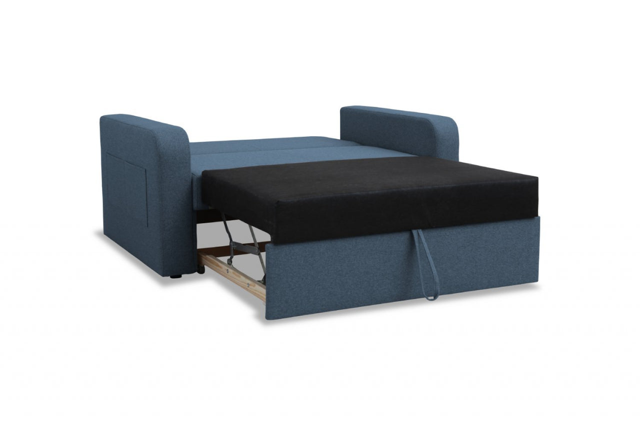 magas fekhelyes, hátulja szövettel bevonva, kiemelő mechanika, karfáján zseb található, három pozícióban állítható háttámla, hullámrugós, szövet, ágyazható, 200 cm szélességig