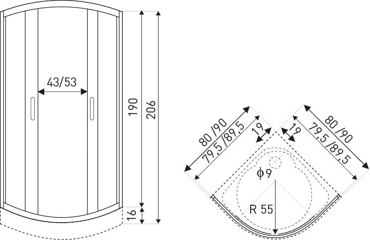 - Méretek - 90x90x190 (zuhanytálca nélkül) 90x90x206 cm (zuhanytálcával)