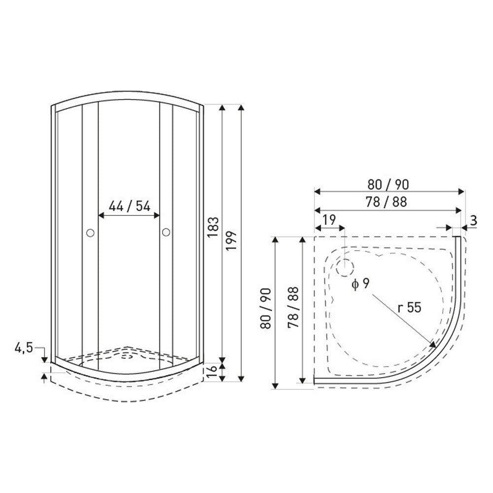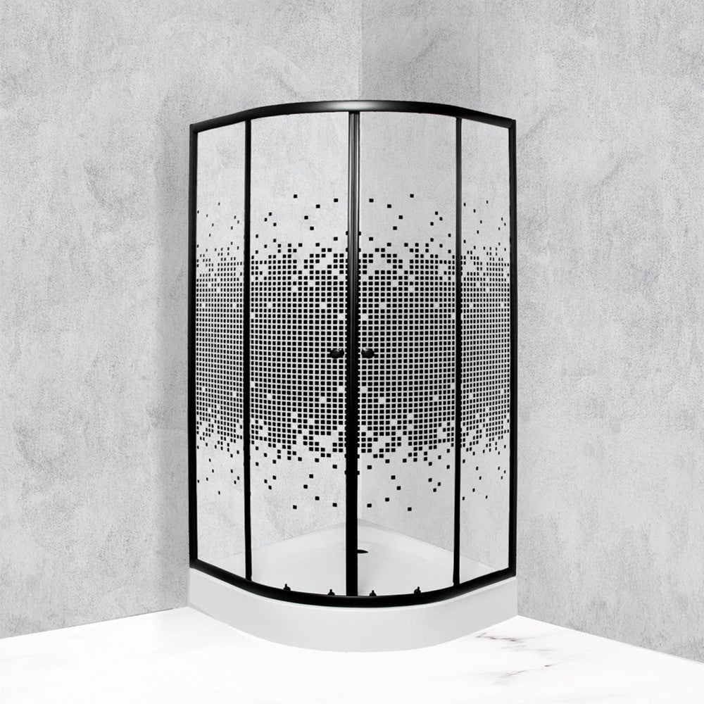 A zuhanykabin 4 mm-es edzett üvegből készült. Fekete dekor négyzetekkel díszített biztonsági üveggel van ellátva. A zuhanykabin íves kivitelben kapható. Dupla görgős ajtókkal van ellátva. A kabin 90x90x183 cm méretű (teljes magassága tálcával: 90x90x199 cm). A fehér akril zuhanytálca 90x90x16 cm!