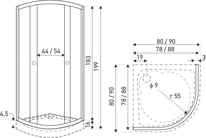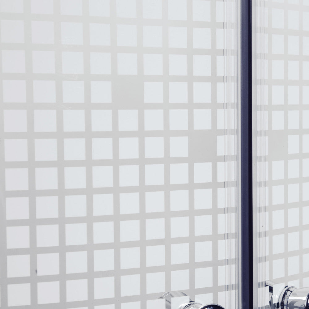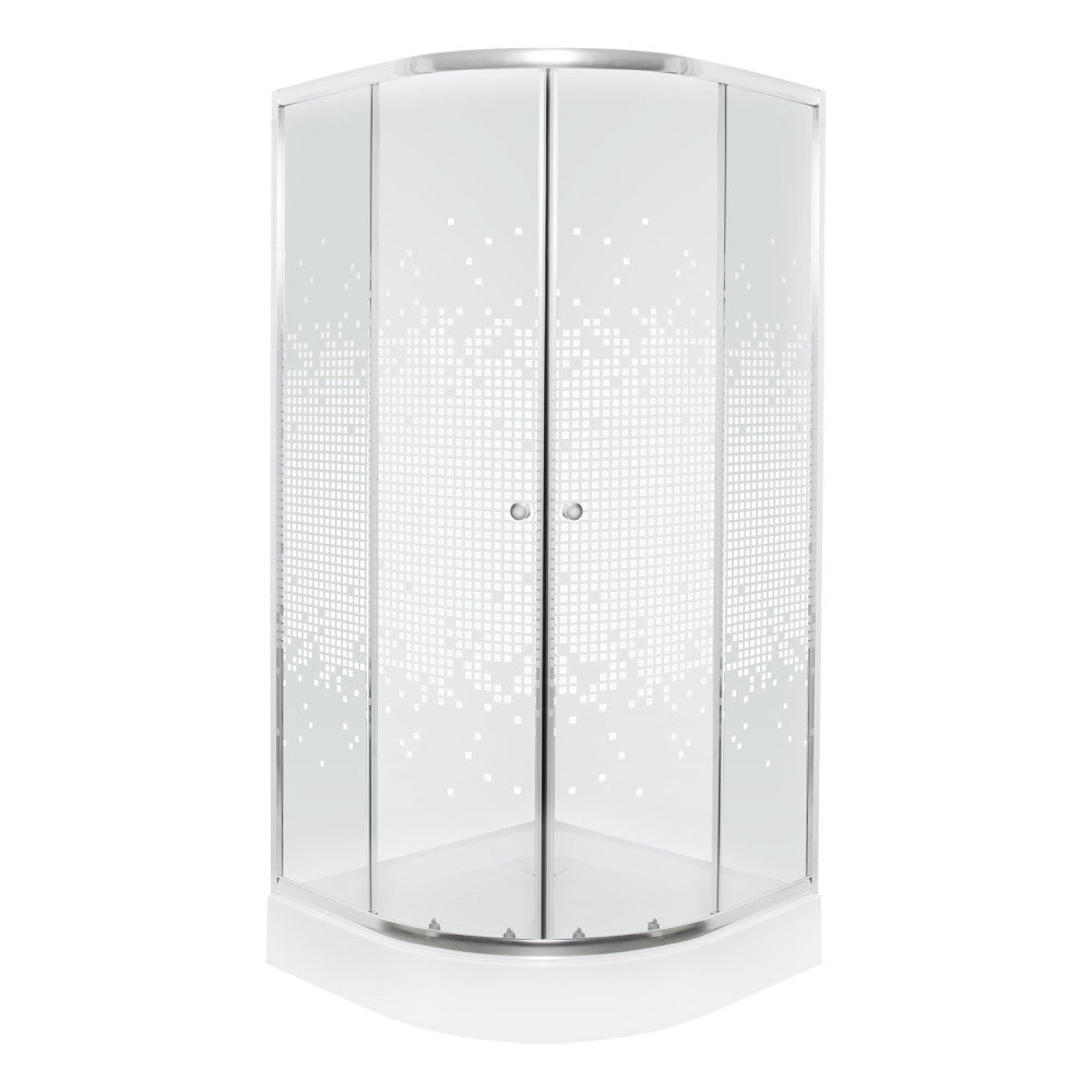 A zuhanykabin 4 mm-es edzett üvegből készült. Fehér dekor négyzetekkel díszített biztonsági üveggel van ellátva. A zuhanykabin íves kivitelben kapható. Dupla görgős ajtókkal van ellátva. A kabin 90x90x183 cm méretű (teljes magassága tálcával: 90x90x199 cm). A fehér akril zuhanytálca 90x90x16 cm!