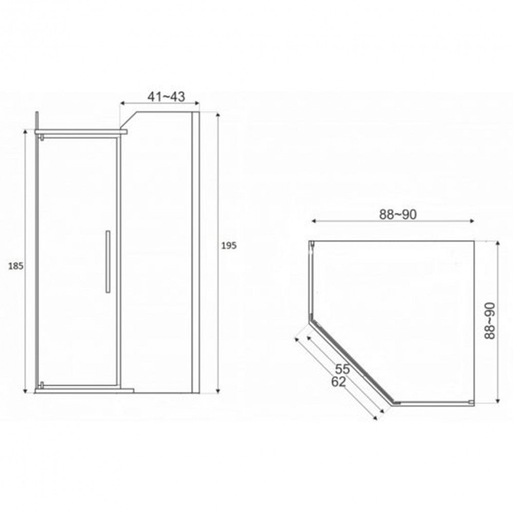 A zuhanykabin 6 mm-es edzett grafit biztonsági üveggel van ellátva Easy Clean bevonattal. A zuhanykabin szögletes kivitelben kapható. Nyílóajtós kialakítással van ellátva. Teljes magasság 195 cm,elülső magasság 185 cm,szélessége 88-90 cm (a profilokon 2 cm állítható). Az ajtó szélessége 62 cm. A kabin bejáratának szélessége 55 cm. Univerzális rögzítéssel van ellátva. Zuhanytálcát a csomag nem tartalmaz.