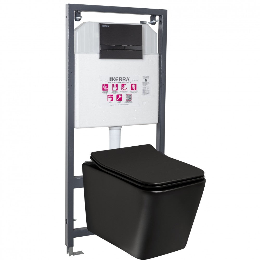 A készlet tartalma: 1 db rejtett rögzítőkeret tartállyal, 1 db Tinos WC-csésze, 1 db Tinos wc ülőke (duroplast, soft-close), 1 db dupla nyomógomb (fekete)
