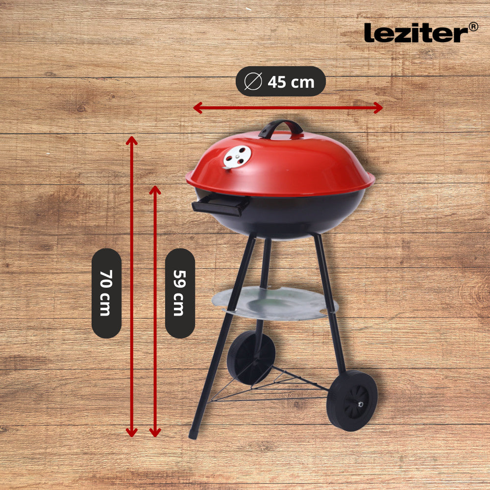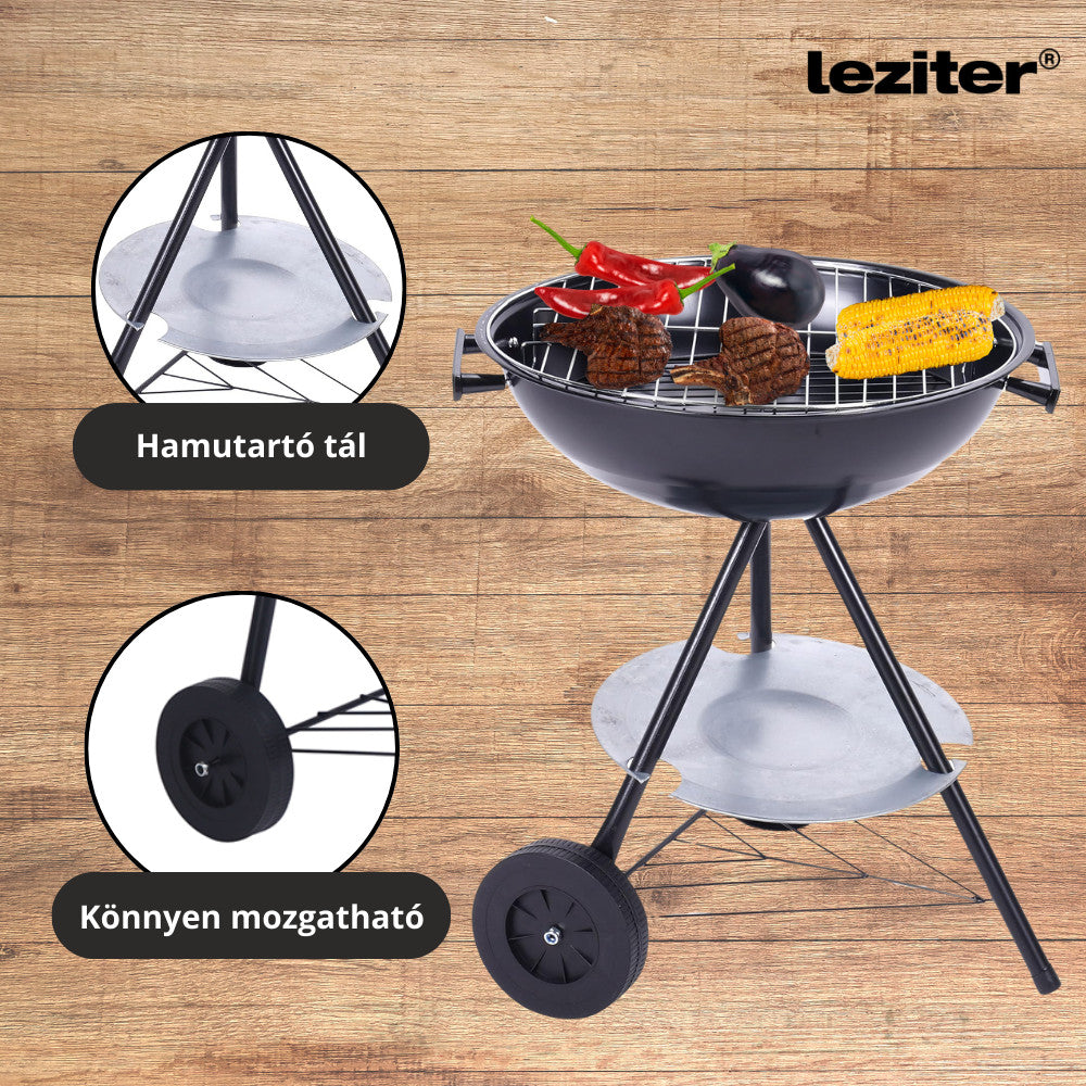 A faszenes kerti gömbgrill sütő ideális választás a szabadtéri grillezés szerelmeseinek. A 45 cm-es átmérőjű sütőfelület elég nagy ahhoz, hogy egyszerre több adag ételt is elkészítsen. A teljes magasság 70 cm, míg a sütőfelület 59 cm magasan helyezkedik el, ami kényelmes használatot biztosít. A beépített kerekeknek köszönhetően könnyen mozgatható, így a kertben, a teraszon vagy akár kempingezés közben is gond nélkül használható.