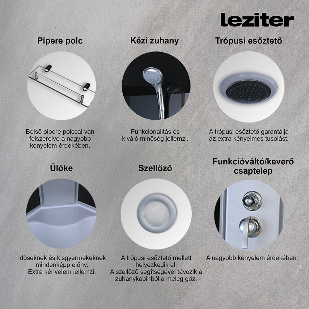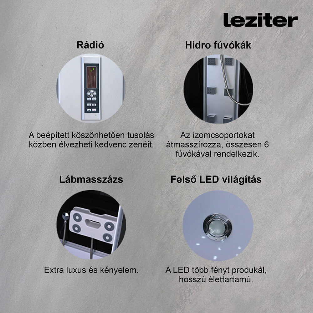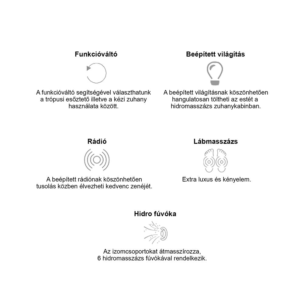 A funkcionalitás mellett természetesen a hidromasszázs zuhanykabin megjelenésére is nagy figyelmet fordítottak. Üvegfelületének, fehér hátfalának és letisztult, modern vonalainak köszönhetően elegáns megjelenést teremt minden fürdőszobának. A Mila zuhanykabin számos hasznos funkcióval rendelkezik. Pipere polccal van felszerelve, melynek köszönhetően rendben lehet tartani a tisztálkodáshoz szükséges eszközeit. Trópusi esőztetővel és kézi zuhannyal is rendelkezik, melyet a funkcióváltóval lehet váltakoztatni. A víz hőmérsékletét a keverő csapteleppel tudod beállítani. A trópusi esőztető mellett helyezkedik el kettő szellőző, melyeknek köszönhetően távozik a felesleges meleg gőz ezzel megakadályozva a kabin párásodását. A kabinba 6 db hidromasszázs fúvóka van beszerelve, lábmasszírozó és rádió melyek biztosítják az extra kényelmet. Ezeken kívül beépített világítás is van a kabinban.