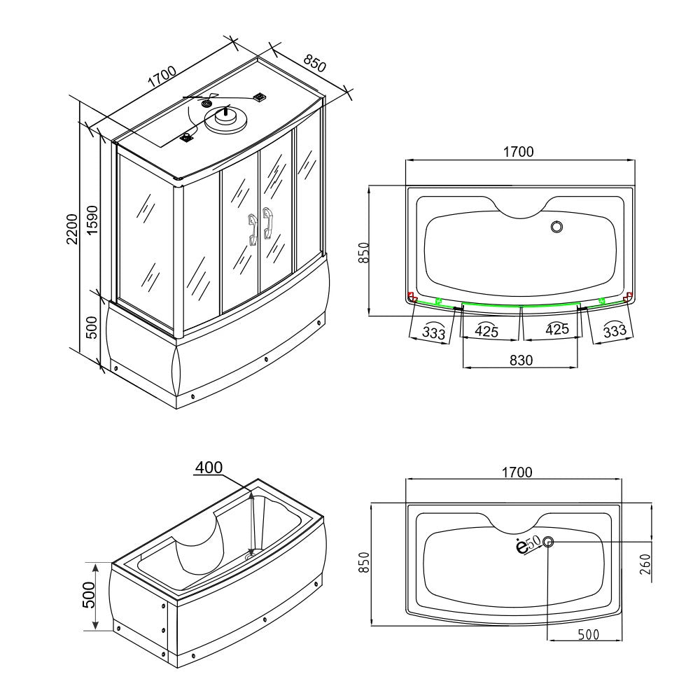 Emilia 170 Hidromasszázs Kádkabin elektronikával Black