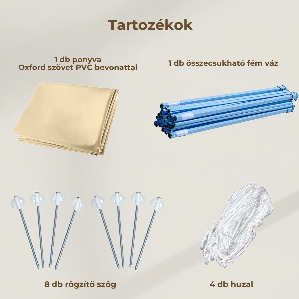 - Tartozékok: A pavilon stabilitását a sarkoknál található karikák, a mellékelt huzalok és rögzítő szegek biztosítják. A csomag tartalmazza mind a 4 db huzalt, mind a 4 db rögzítő szöget, így garantálva a biztonságos és stabil felállítást.