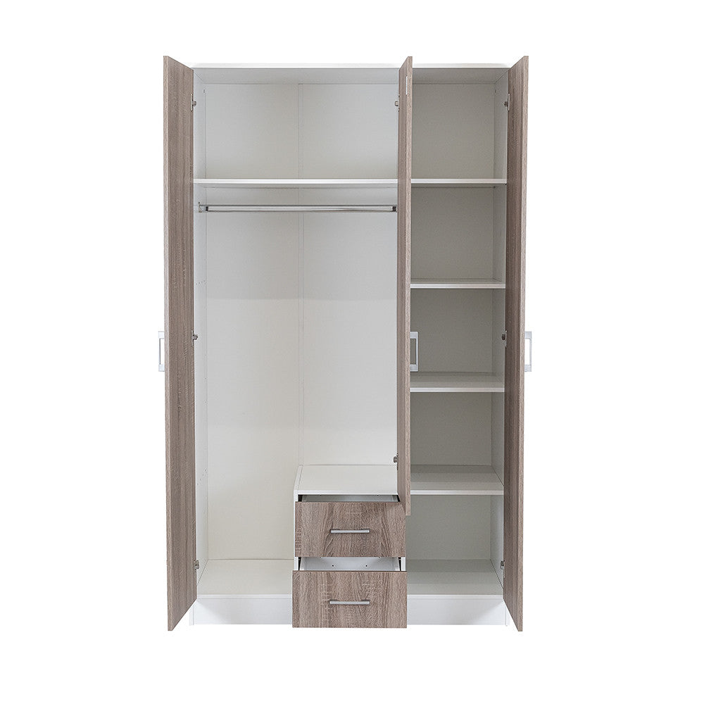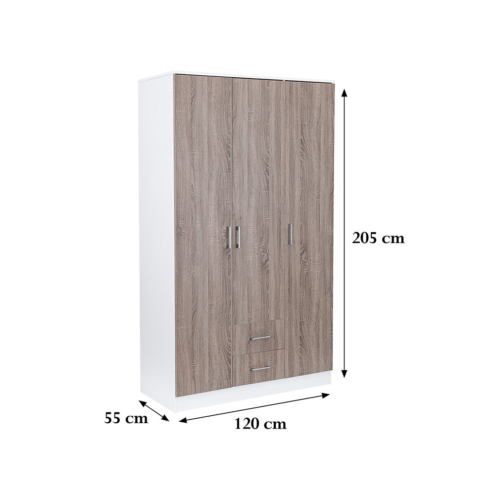 Az elegáns yorki tölgy front és a fahatású fehér korpusz ötvözete tökéletes harmóniát teremt a nappaliba vagy a hálószobába egyaránt. A 205 cm magas, 120 cm széles és 55 cm mély gardróbszekrény ideális választás mindenki számára, aki szeretné rendszerezni ruháit és kiegészítőit.