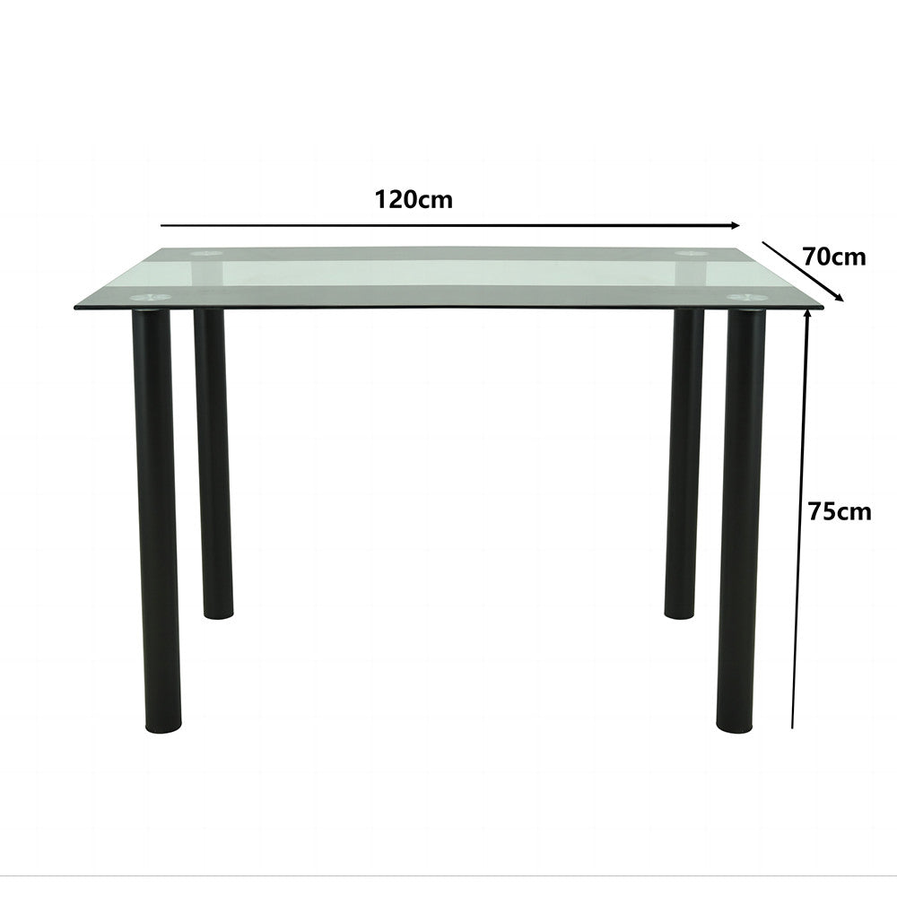 - Minőségi anyagok: Az asztal 8 mm vastag, edzett üveg asztallapja ellenáll a mindennapi használat során keletkező kopásnak és karcolásoknak, míg az acél váz stabilitást biztosít.