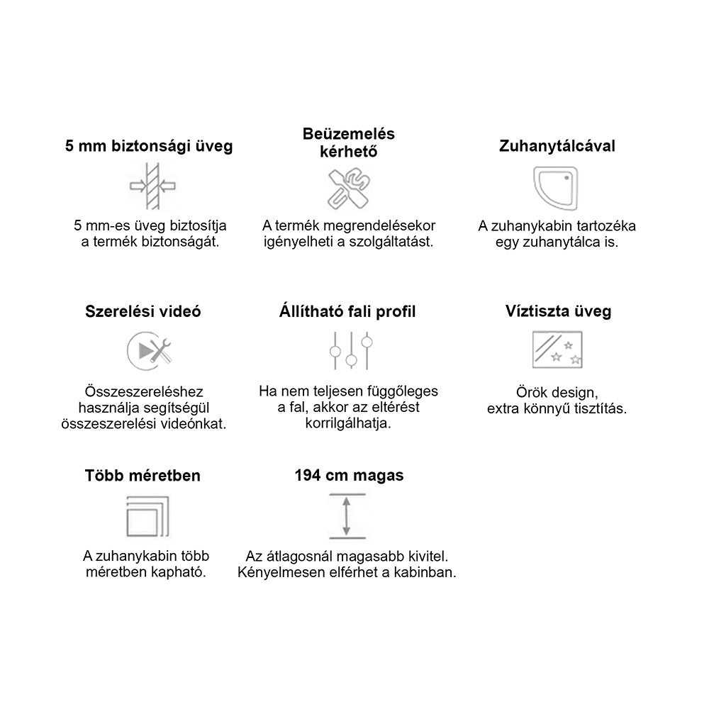 Műanyag vízzáró profilokkal rendelkezik, hogy a víz a kabinon belül maradjon. Az állítható fali profilok segítségével, ha nem teljesen függőleges a fal, akár 15 mm eltérést is korrigálhat. Amennyiben tálca nélkül rendeli, 180 cm-es magassággal, ha pedig szettben erősített akril zuhanytálcával, akkor 194 cm-es magassággal számolhat.