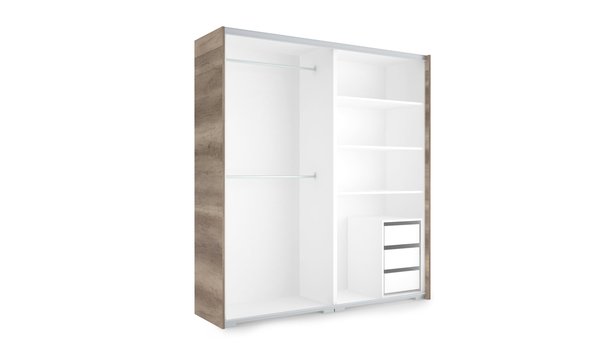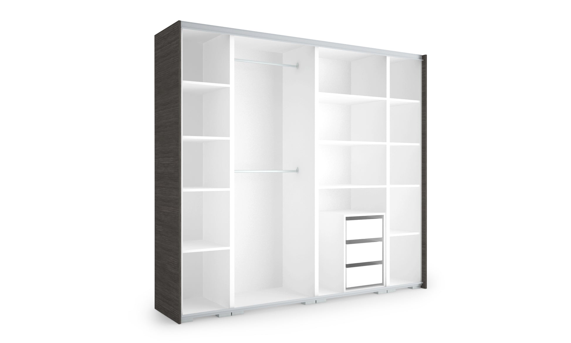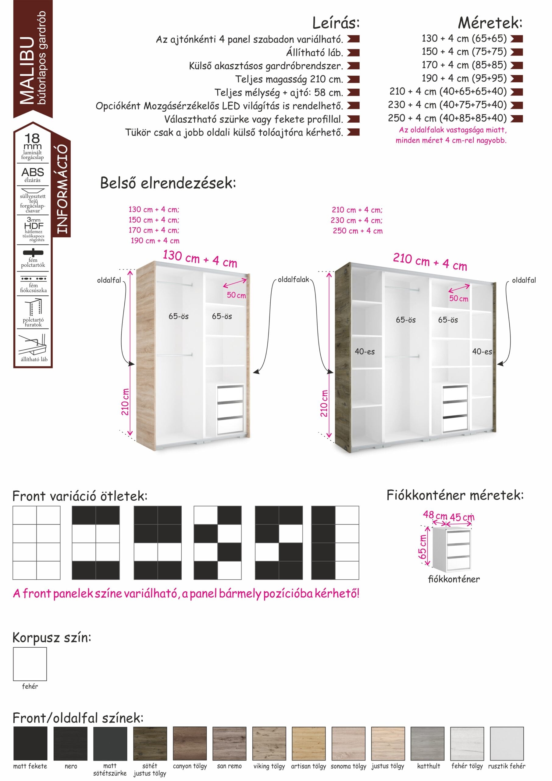 Elegáns külső, praktikus belső elrendezés jellemzi. A 2 ajtó 8 panelből áll. Az oldalfal és a panelek is 11-féle színben kérhetőek, így a legkülönfélébb színvariációk állíthatóak össze. Gardróbunk rendelhető egy színben, soronként vagy akár sakktábla minta szerint változó színű ajtóval. Az ajtó kérhető tükörrel is! Még a profil színét is kiválaszthatjuk, lehetőség van szürke vagy fekete profillal kérni a terméket. A 210 cm-es magasságnak és a 7-féle szélességnek köszönhetően remek választás a kisebb szobával rendelkezőknek és a nagy tárolóhelyre vágyók számára egyaránt.