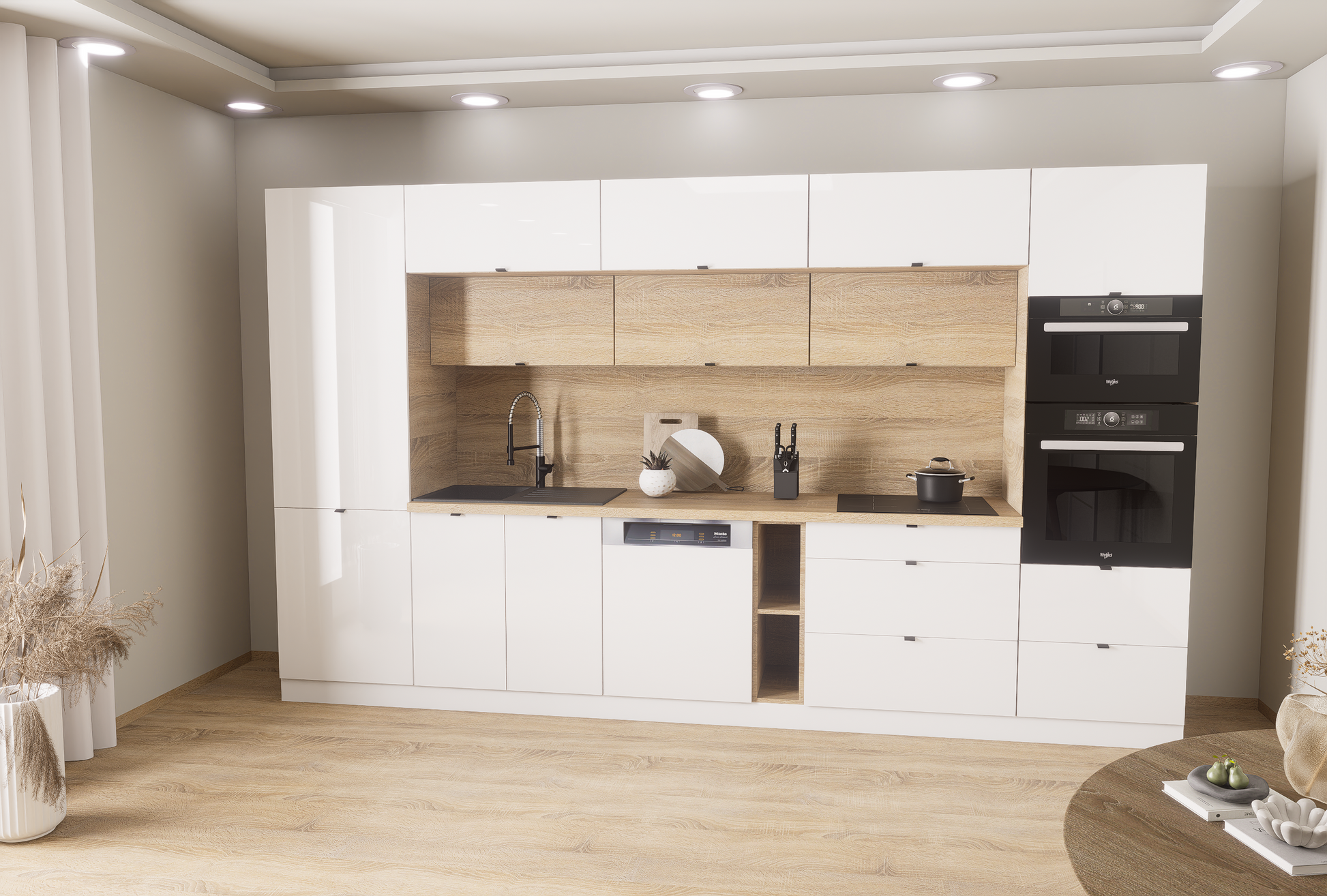 Milánó 360cm konyhablokk ( munkalappal ) 215cm magas mélyített felső sorral