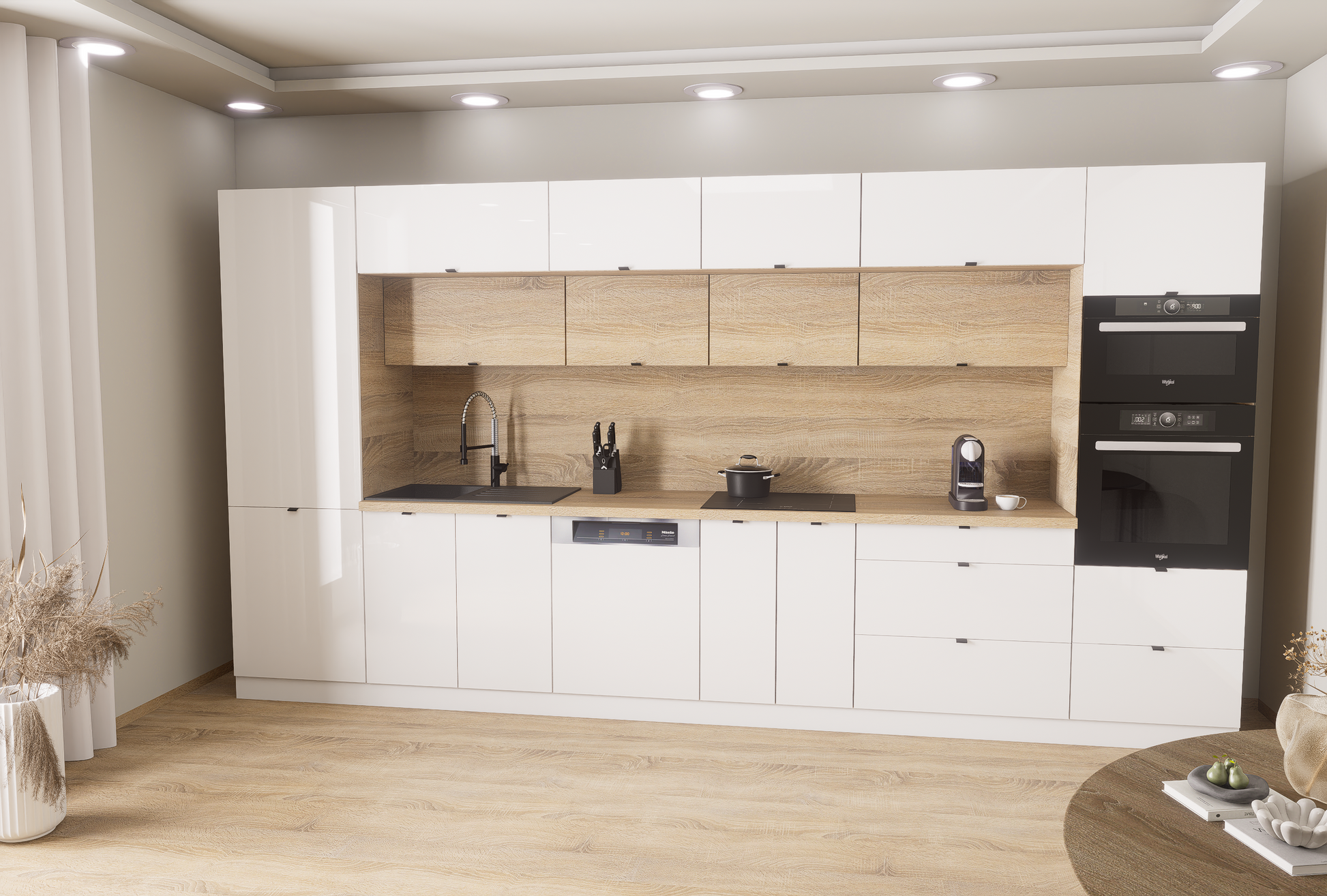 Milánó 400cm konyhablokk ( munkalappal ) 215cm magas mélyített felső sorral