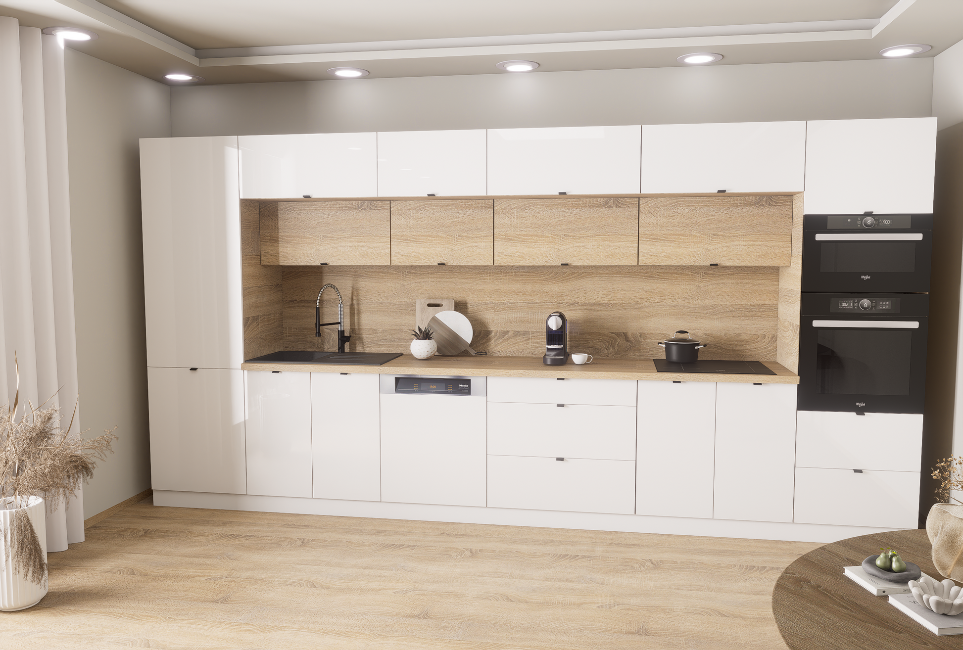 Milánó 420cm konyhablokk ( munkalappal ) 215cm magas mélyített felső sorral