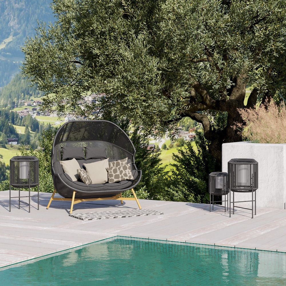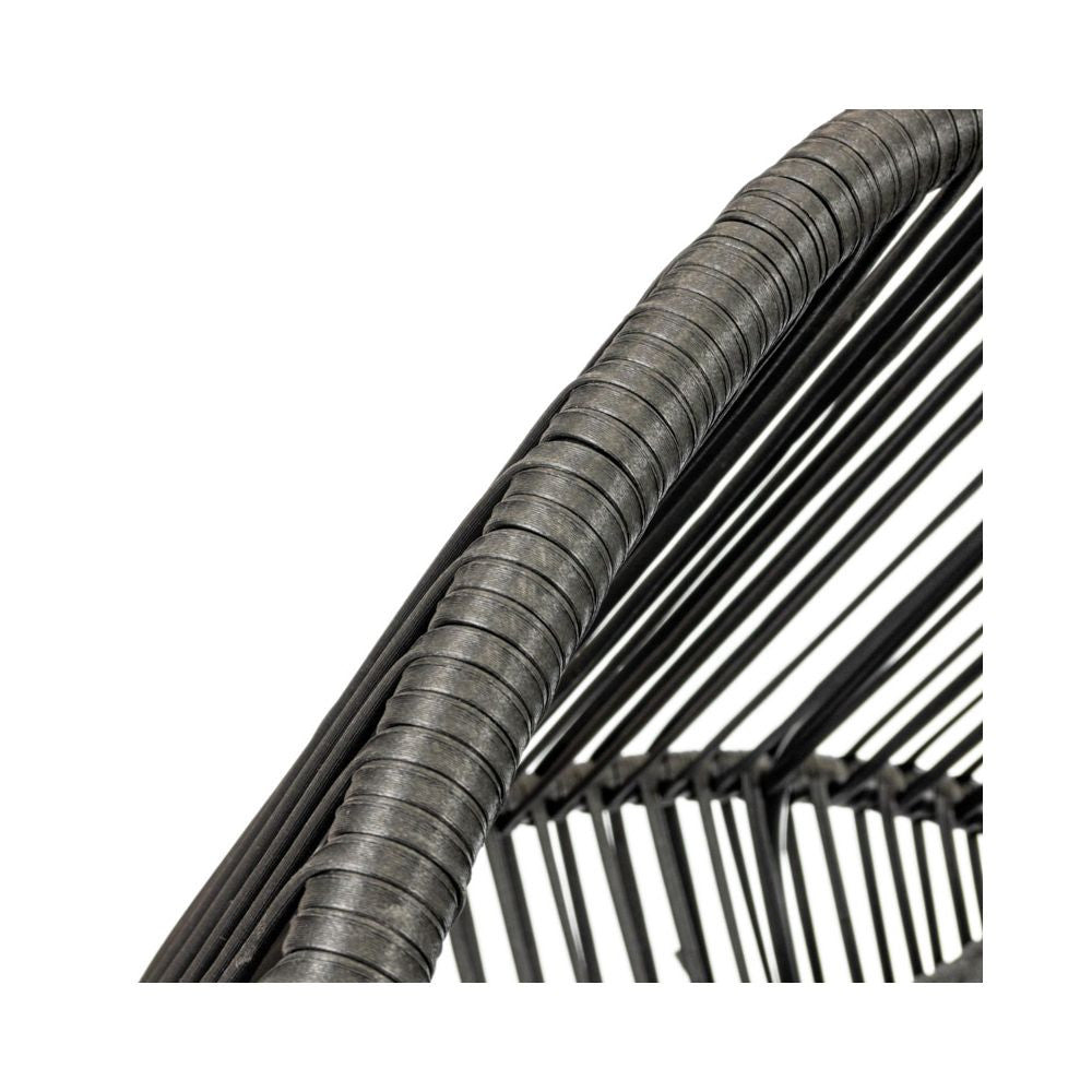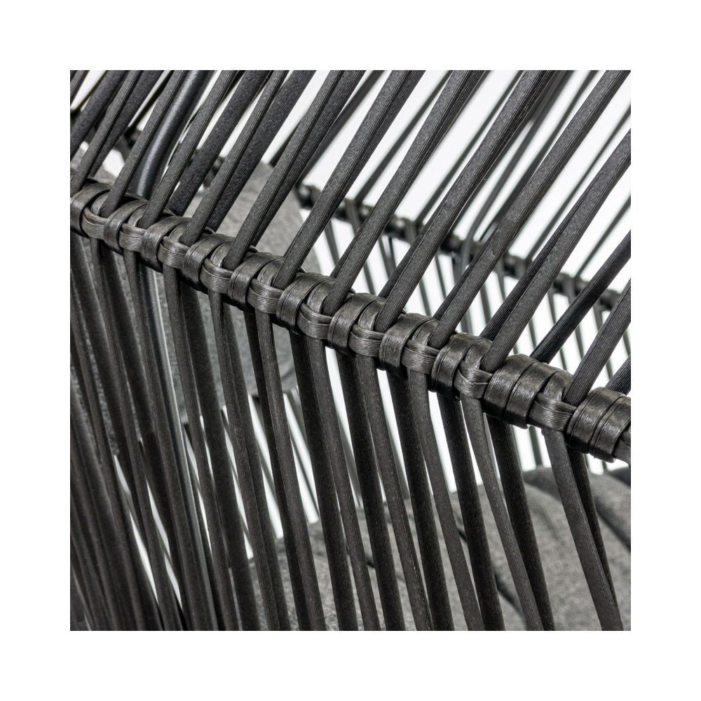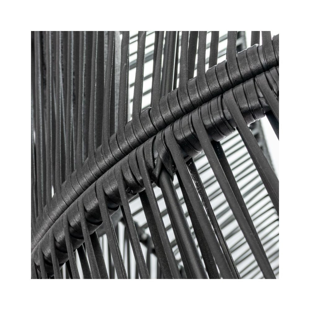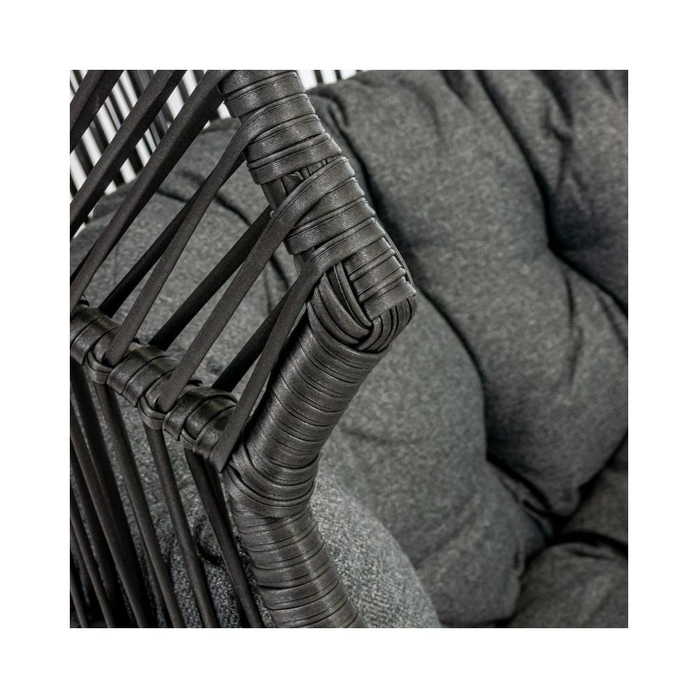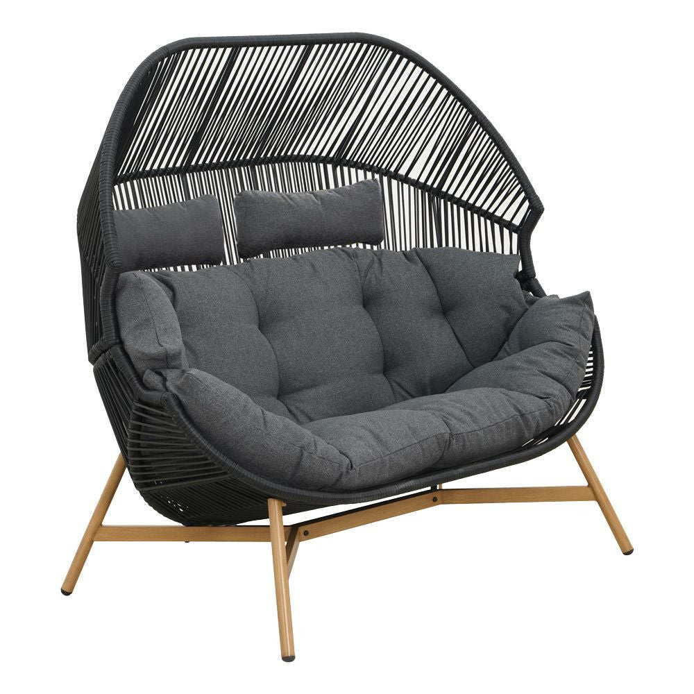 A két személy számára való kikapcsolódás most még szórakoztatóbb lehet a nagy, párnázott fotelnek köszönhetően . Az ergonómikus kosár bármilyen helyzetben való pihenéshez készült . Az egész szerkezetet egy puha párna egészíti ki, amely tovább növeli a pihenés kényelmét. A kétüléses fotel az aktuális trendeknek megfelelően eredeti dizájnjával tűnik ki. A fa színű lábakkal ellátott fekete kosár kombinációja nagyon modernnek tűnik. A fekete színű acél kerti fotel divatos belső terekbe ajánl különféle stílusokat .