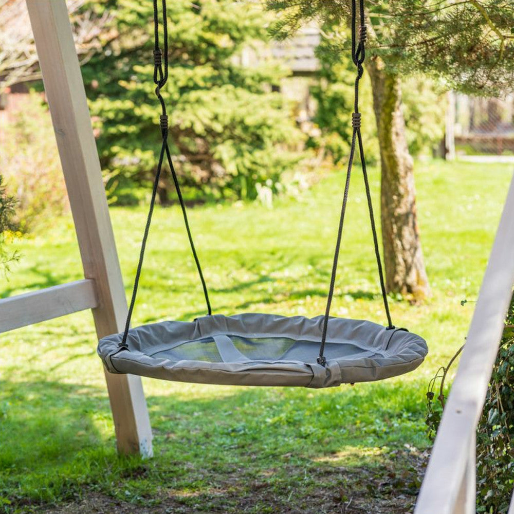 A fészekhinta konstrukciója hab szerkezetű burkolattal rendelkezik , amely csökkenti az ütközés kockázatát játék közben. További előny a burkolat a kötelek és az ülésszerkezet közötti csatlakozásoknál. A függőhinta széles ülése biztonságos játékot tesz lehetővé. A hintának fekete PP szövetből készült ülése van , melynek különleges előnye a nagy szennyeződésállóság.