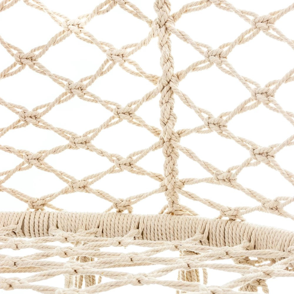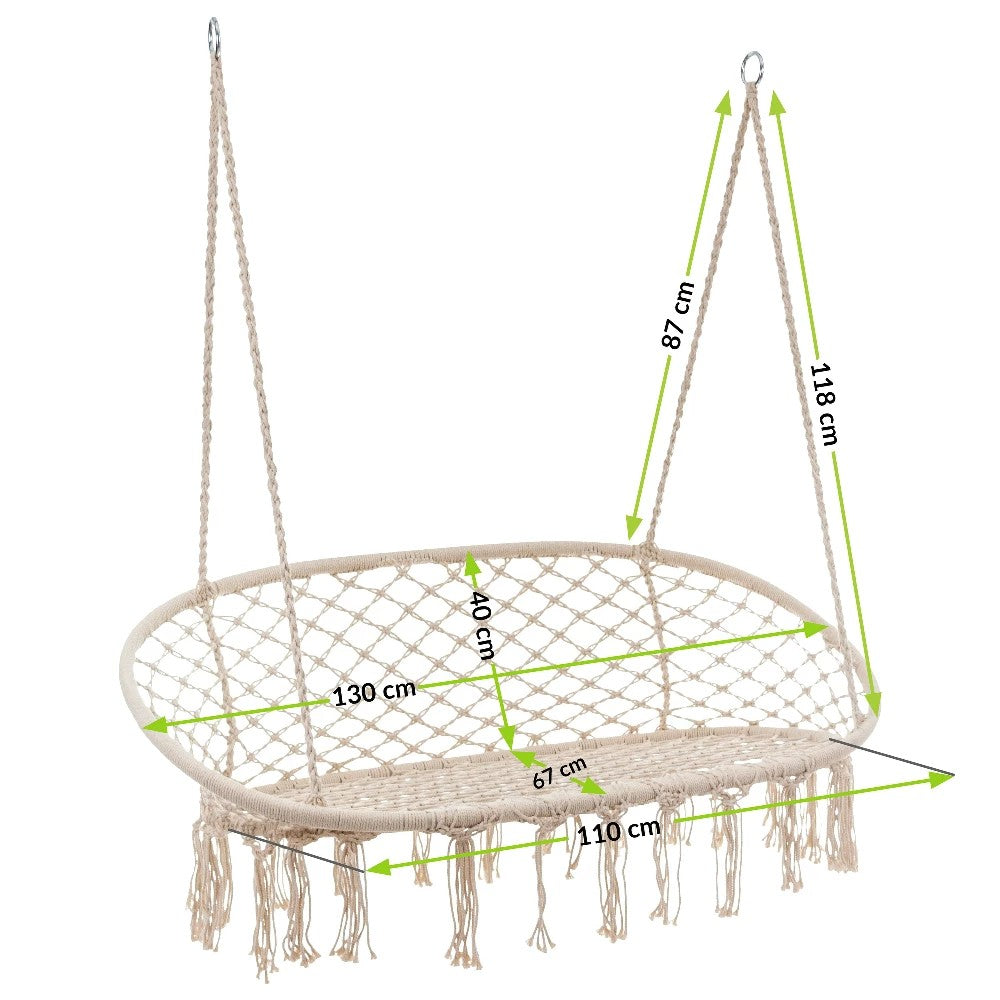 Nagy méretének köszönhetően két személy is könnyedén tudja használni a boho hintát. A brazil szék különleges előnye a magas háttámla , amely jelentősen növeli az ülés komfortját. A készlet köteleket és fémgyűrűket tartalmaz. A további összeszerelési elemek biztosítása a megrendelő felelőssége, és a kiválasztott helytől függ (pl. mennyezet a házban, gerenda a pavilonban). A képen látható párnák nem tartoznak a készlethez
