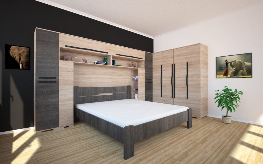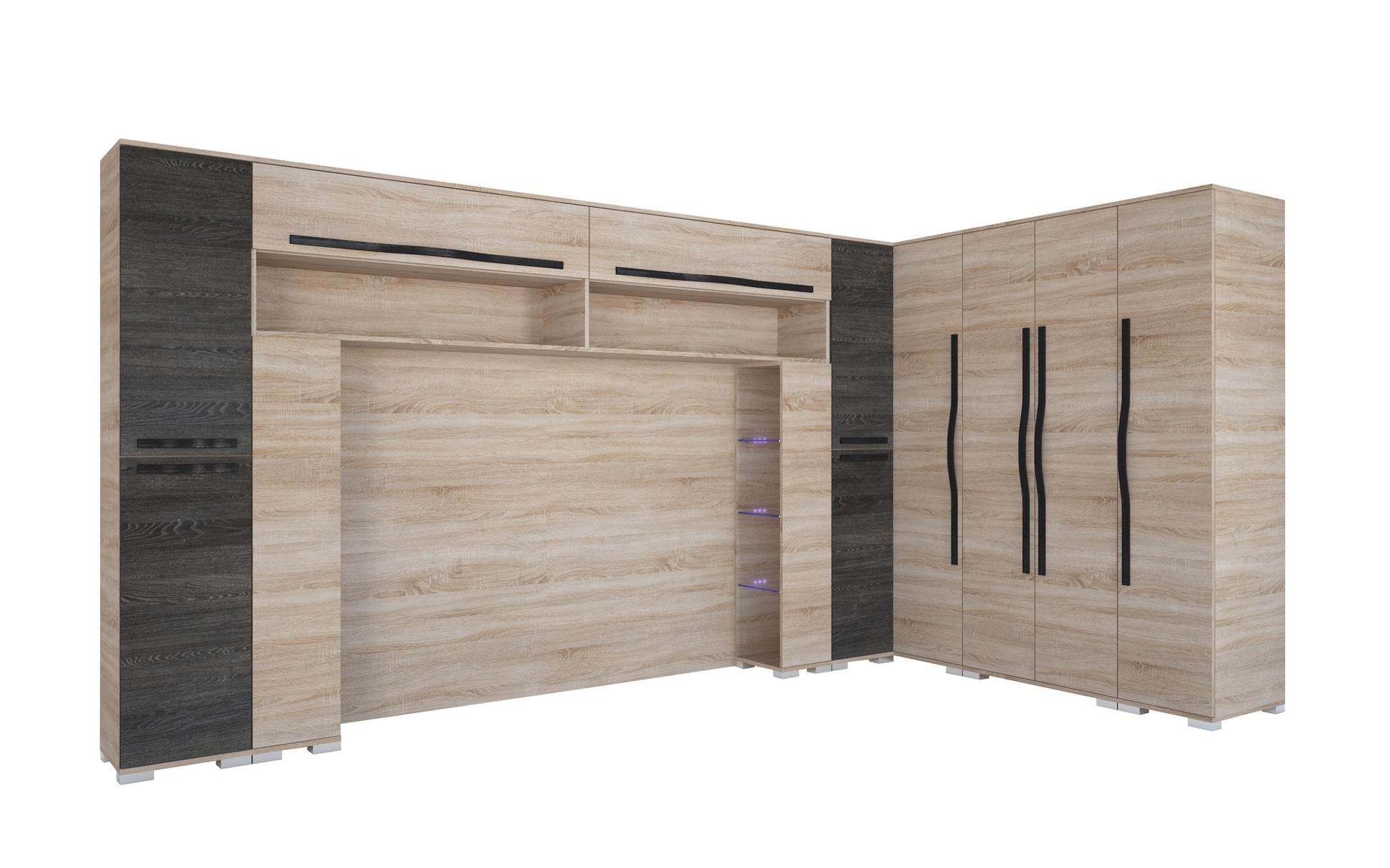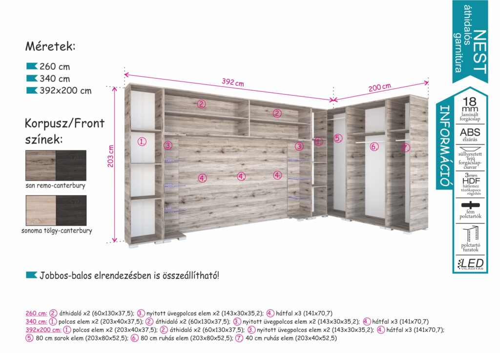 A Nest áthidalós garnitúra 392 x 200cm-es méretével ideális helykihasználást tesz lehetővé a hálószobában. A beépített led világítás kellemes hangulatot teremt otthonában. San remo-conterbury színösszeállításban kapható. Jobbos-balos elrendezésben is összeállítható! 18 mm es laminált forgácslap, ABS élzárás, süllyeztett fejű forgácslapcsavar,3mm HDF hátlemez tűzőkapocs rögzítés, fém polctartók, polctartó furatok, LED világítás.