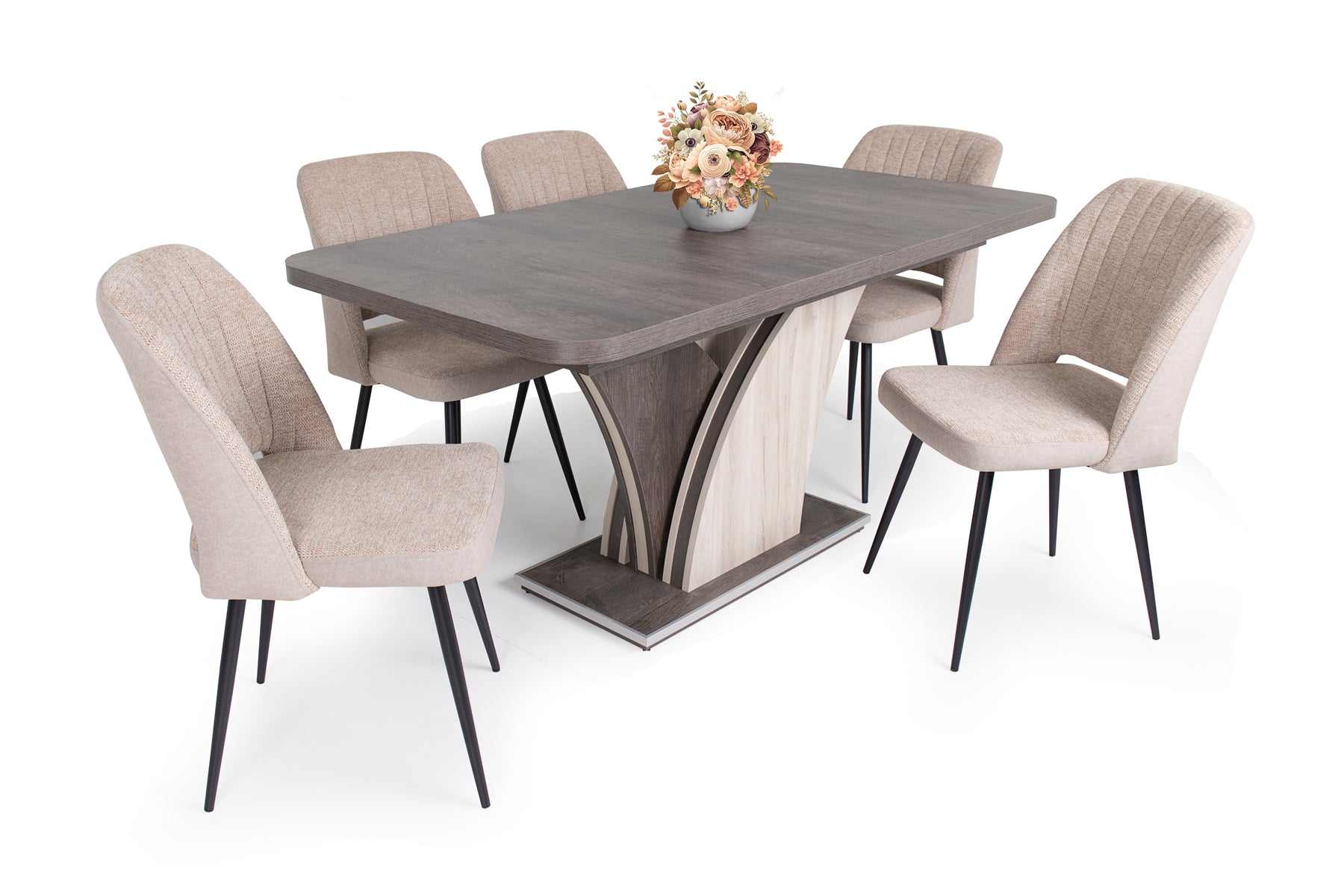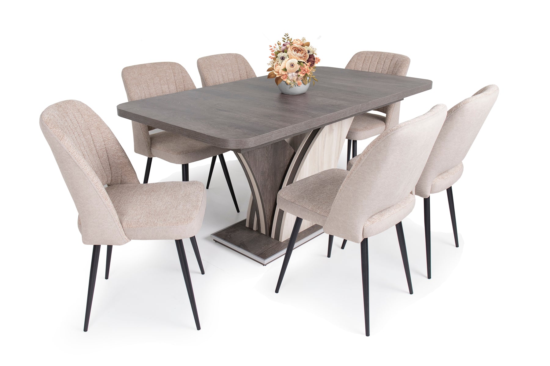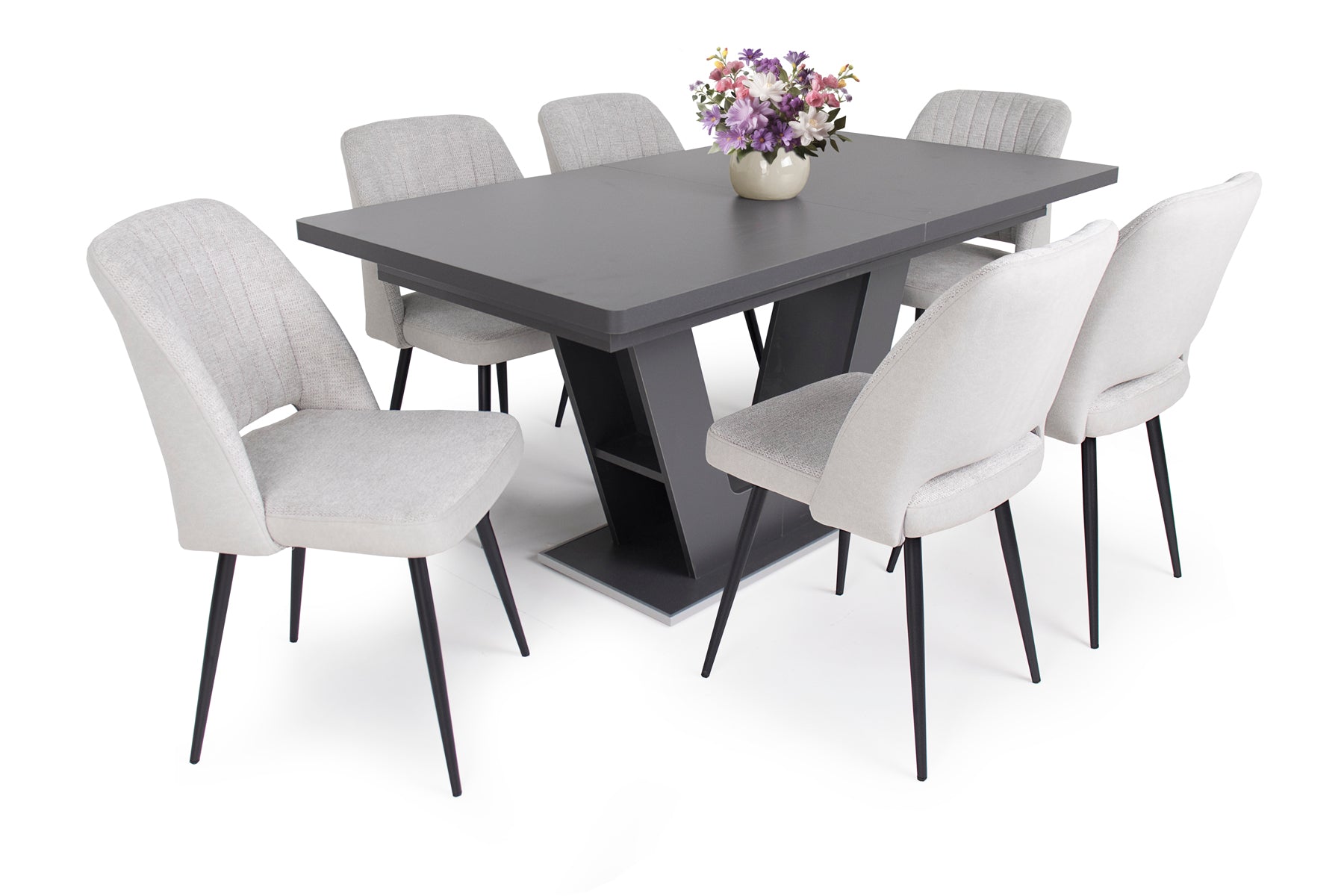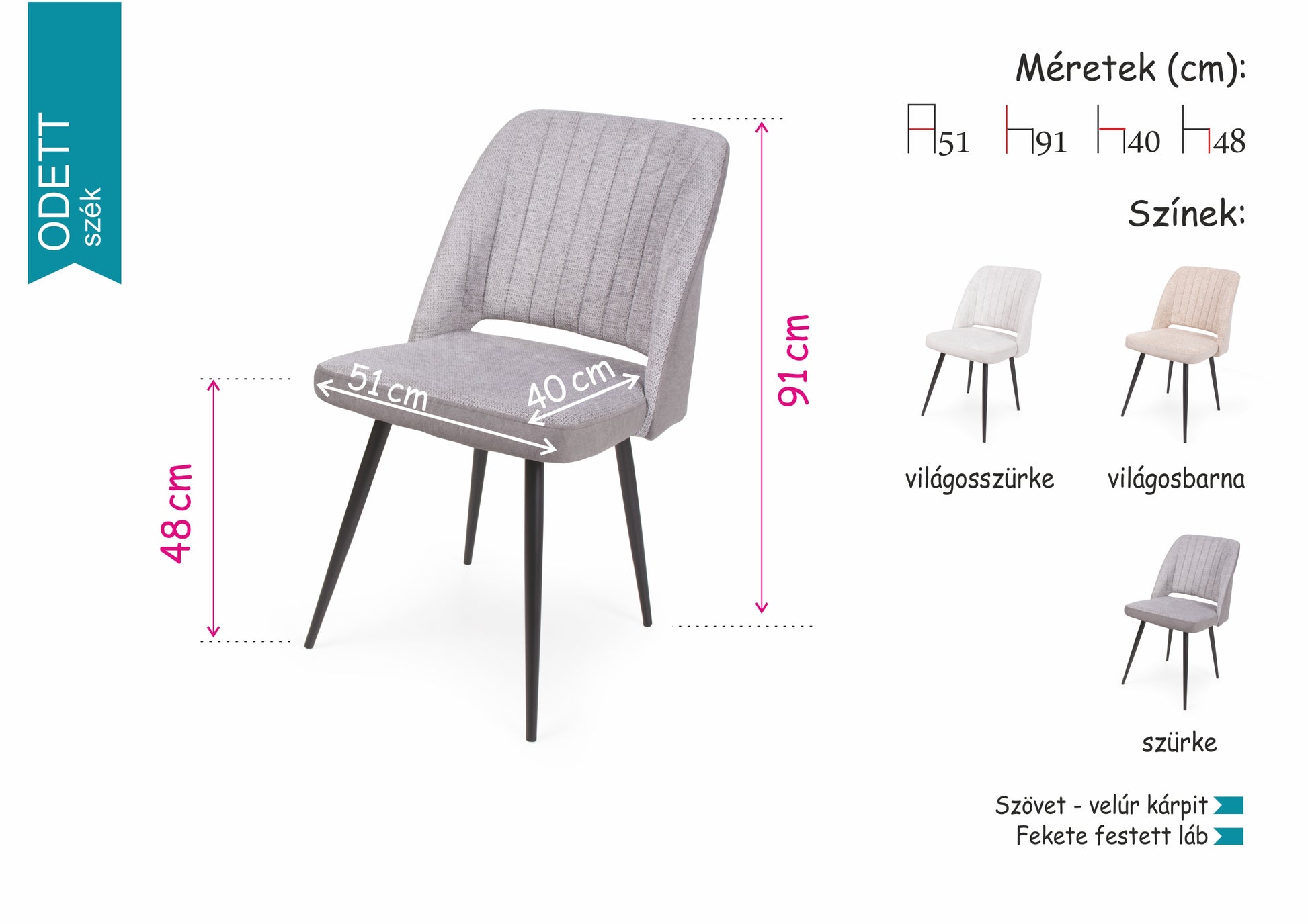 Az Odett szék szövet – velúr kárpittal és fekete festett lábakkal kitűnő kiegészítője a modern otthonoknak. Három színben érhető el: világosszürke, világosbarna és szürke.