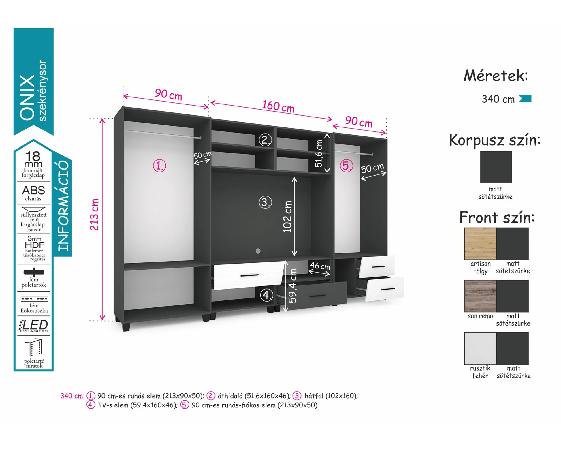 Az Onix szekrénysor egy méretben kapható. A 340 centiméteres kivitel jól kihasználható részekből épül fel. A szekrénysor tükörrel és LED világítással is rendelhető. A tükrös ajtók a komfortos öltözködést segítik, és a teret is növelik a hálószobában.