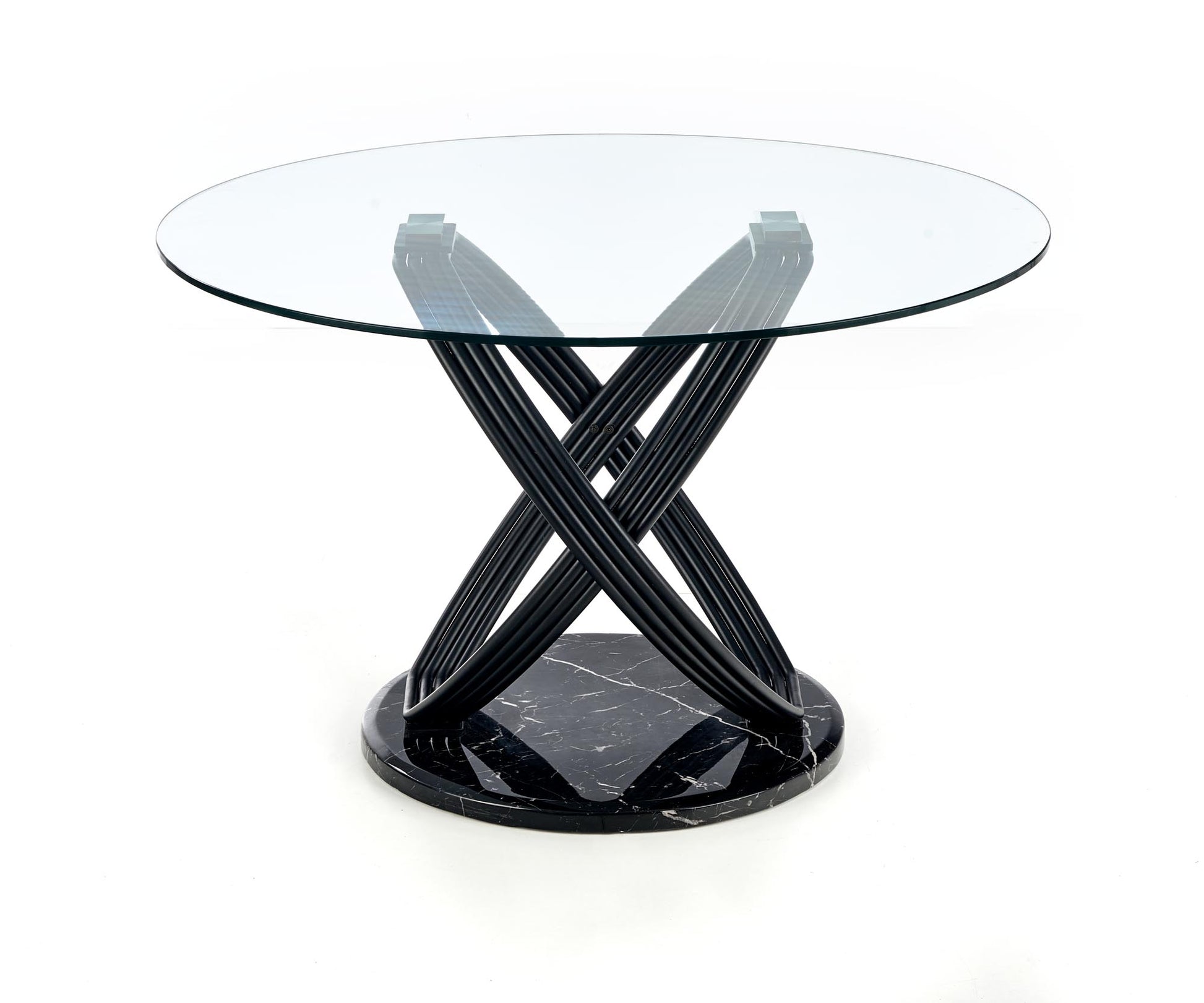 méretek: o122/77 cm, anyaga: üveg / porszórt acél / műkő, szín: felső - átlátszó, lábak - fekete
