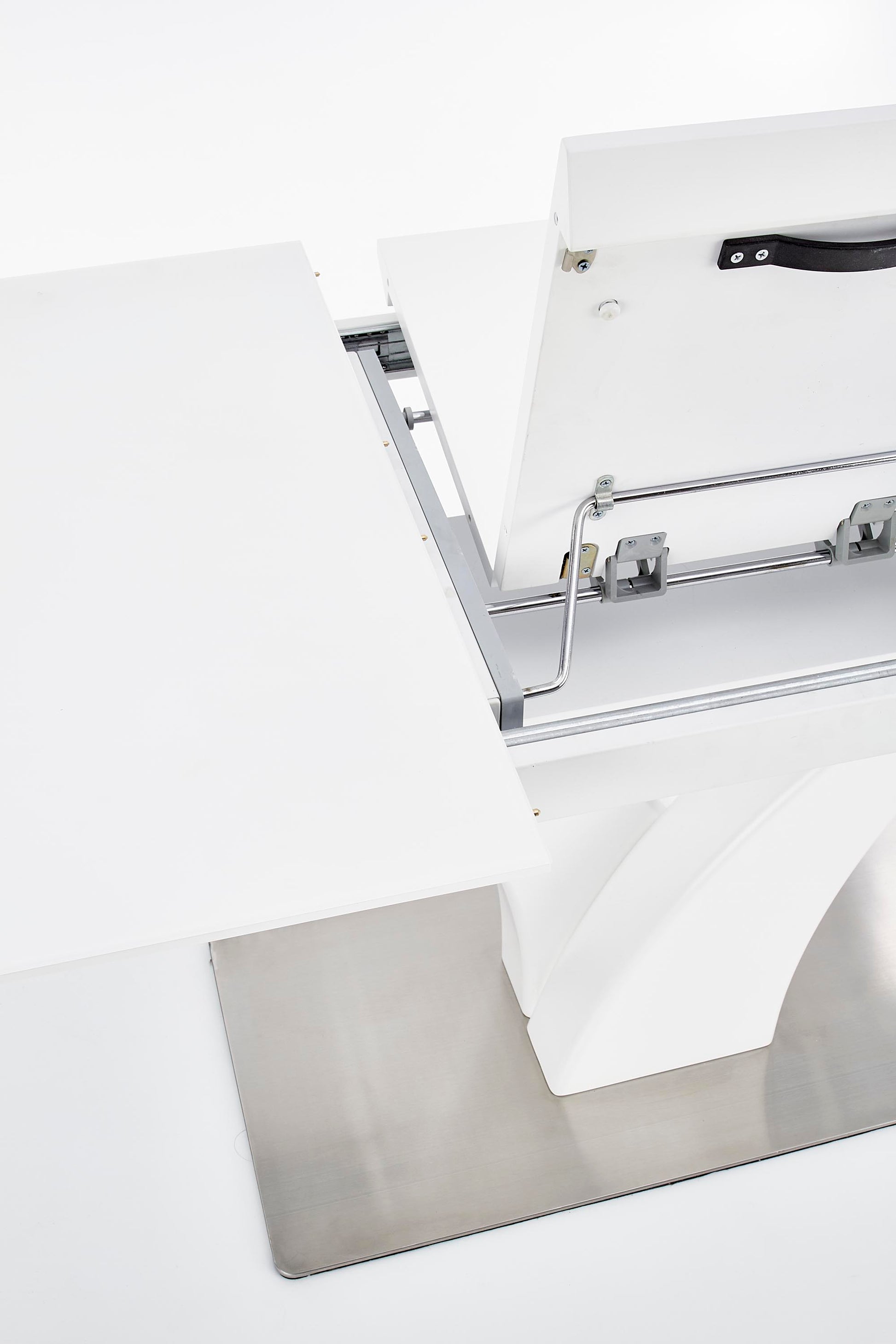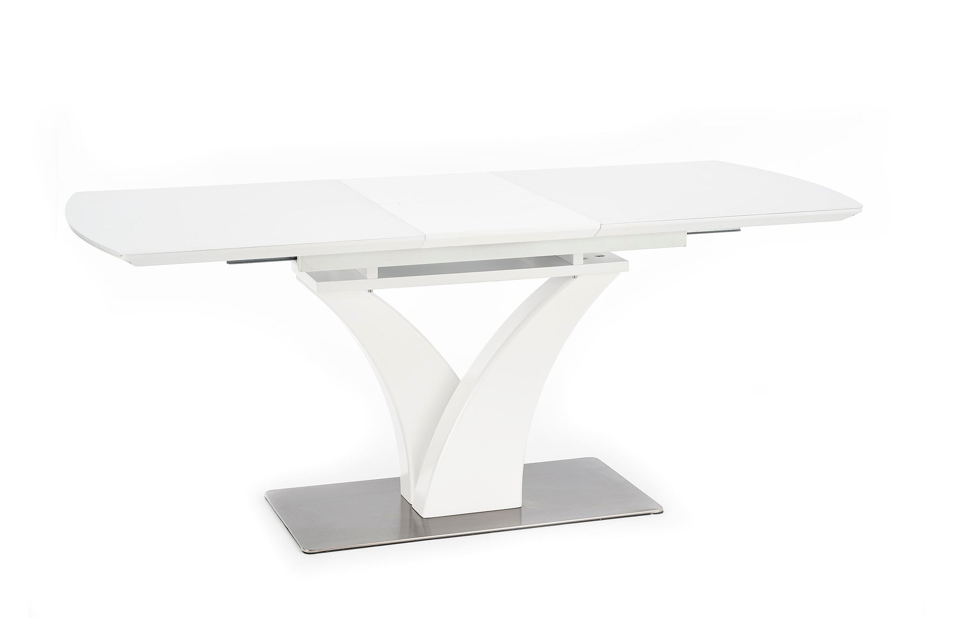 méretek: 140÷180/80/75 cm, bővítőasztal, anyaga: üveg / lakkozott MDF / rozsdamentes acél, szín: fehér
